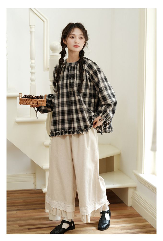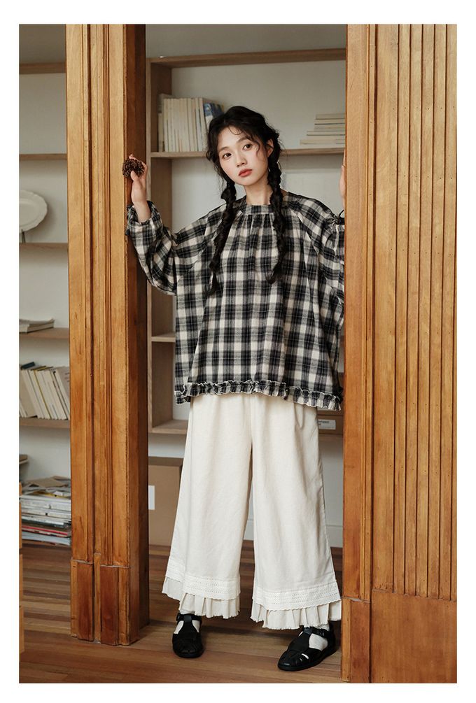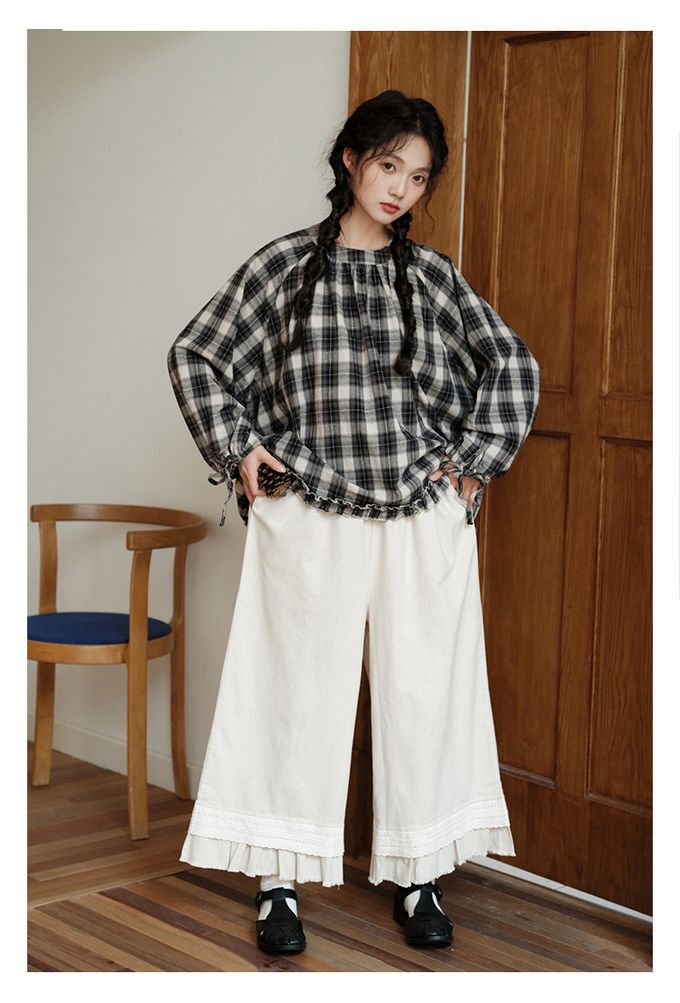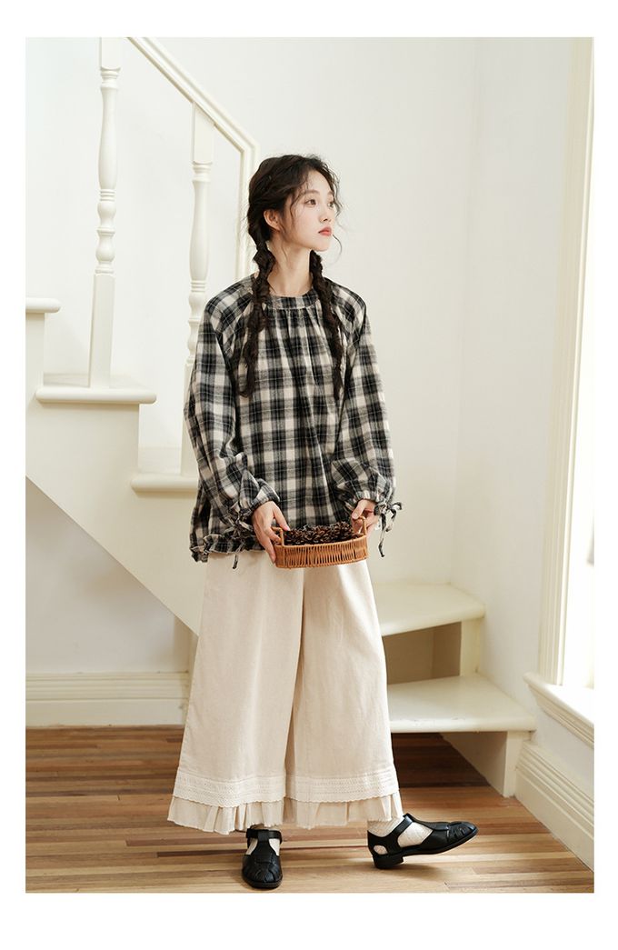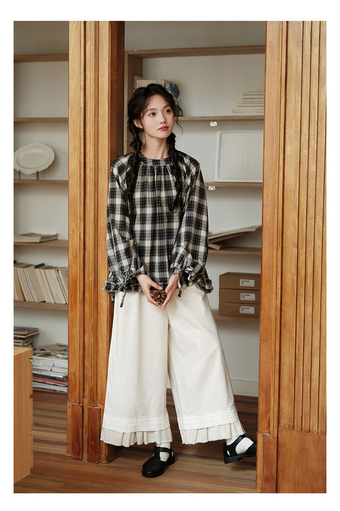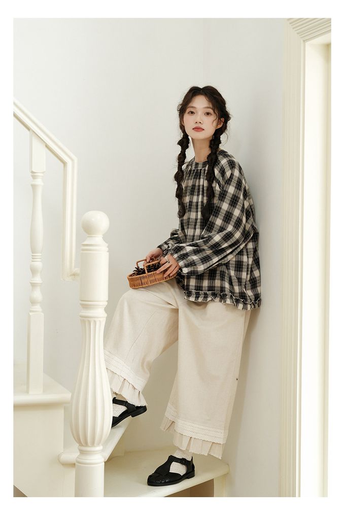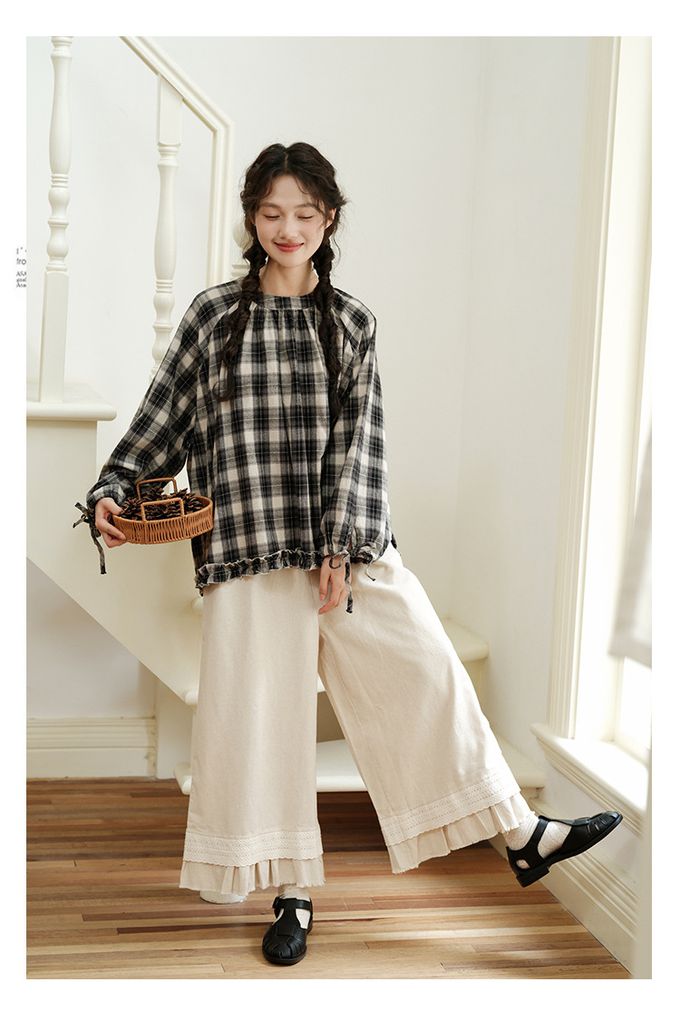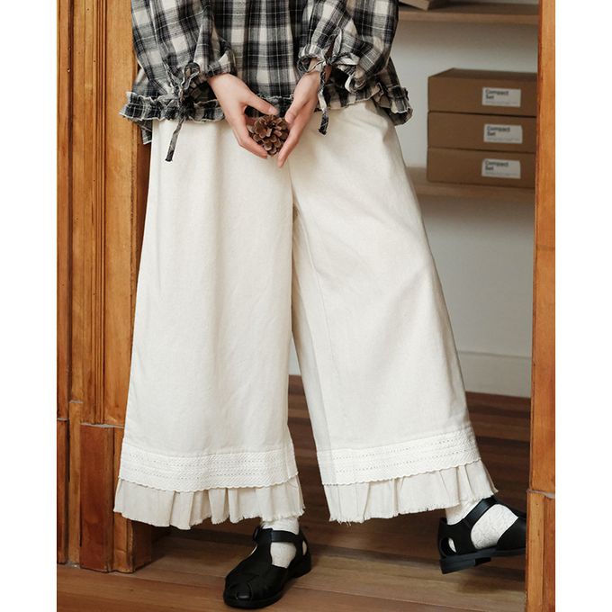 日系文藝森林花邊休閒九分寬褲-杏色 (F)