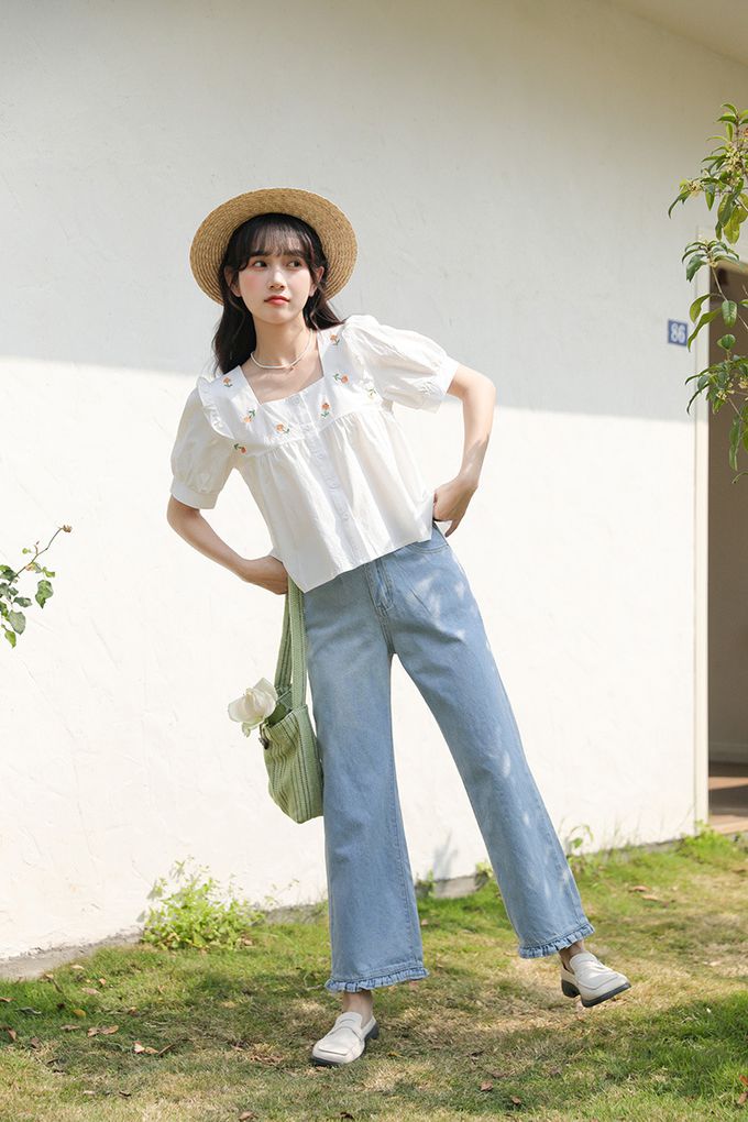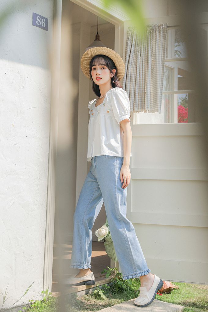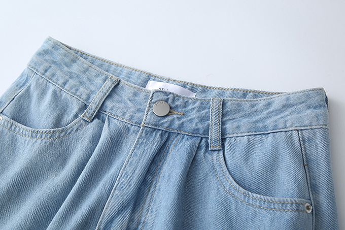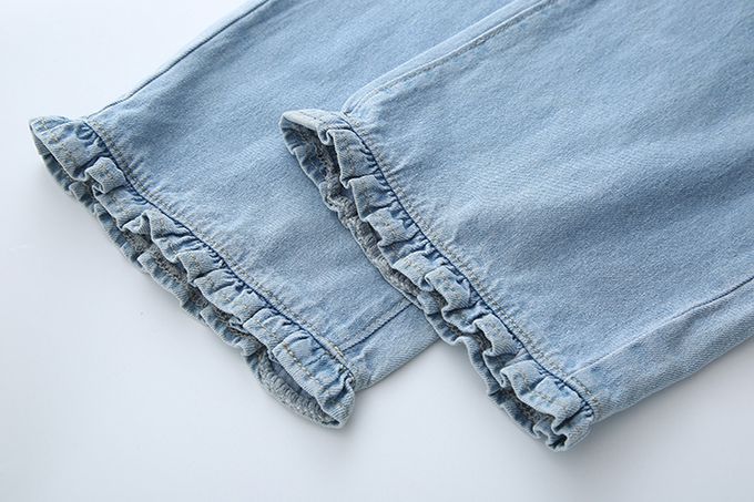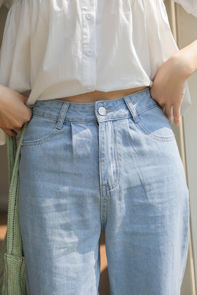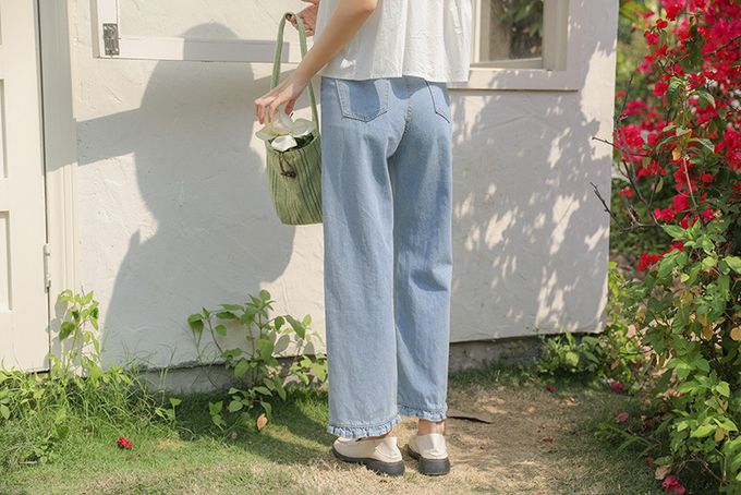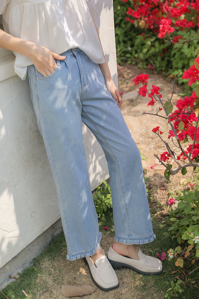 • 品名:日系高腰荷葉下襬直筒牛仔長褲