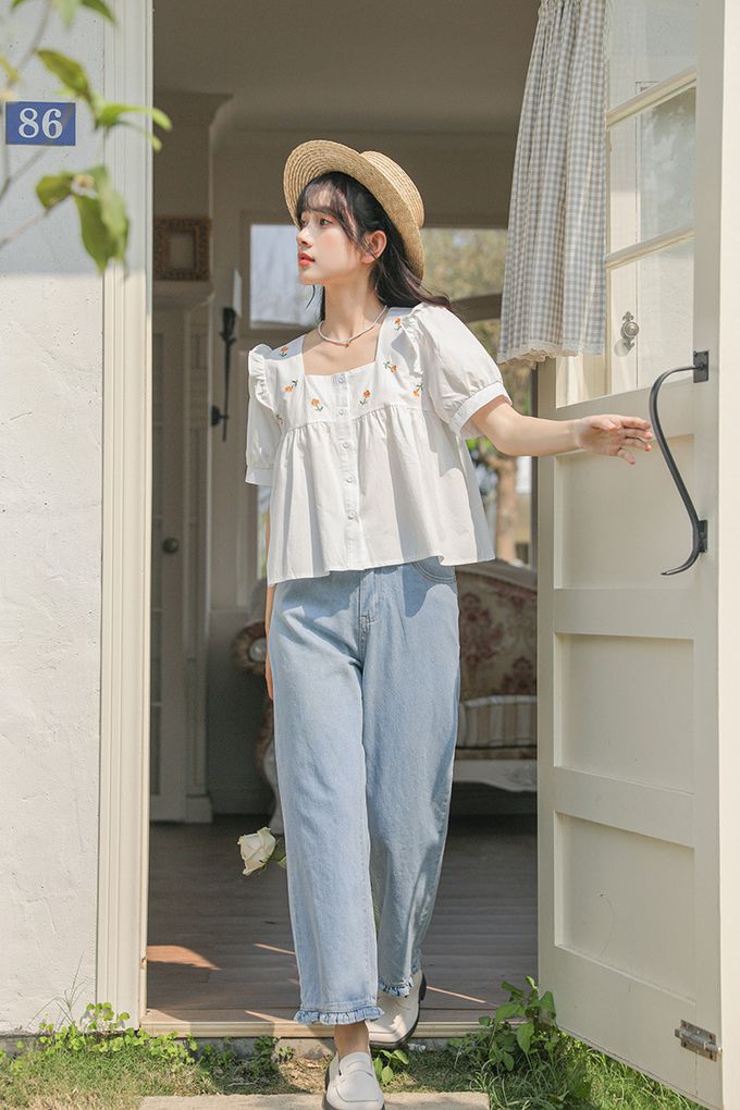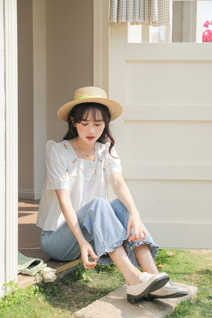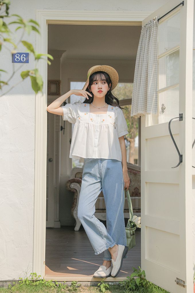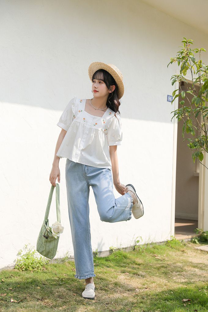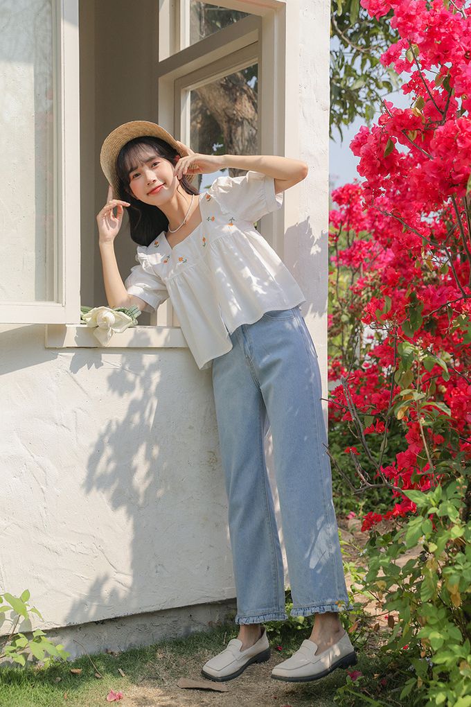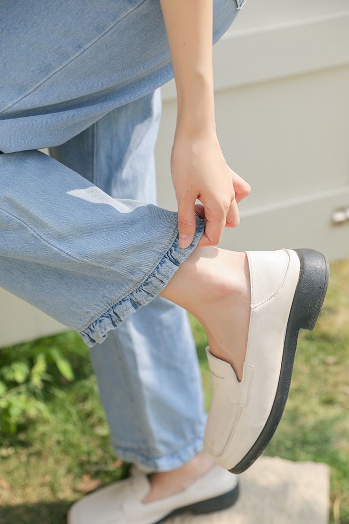 • 品名:日系高腰荷葉下襬直筒牛仔長褲