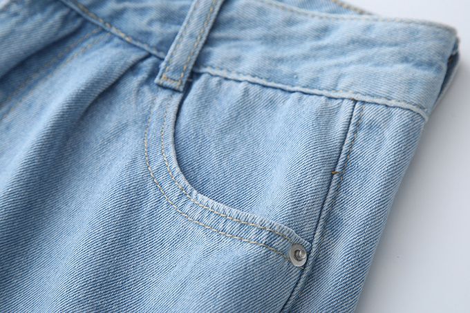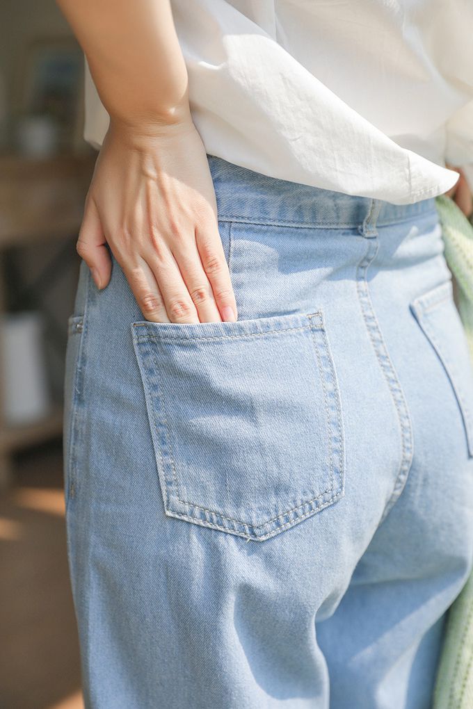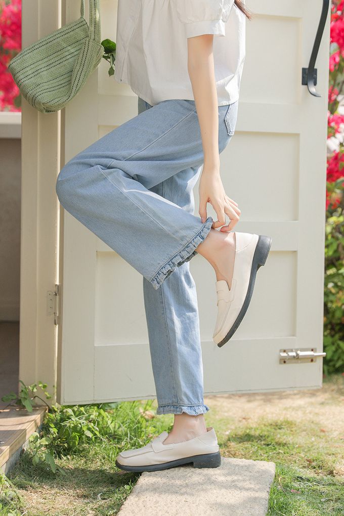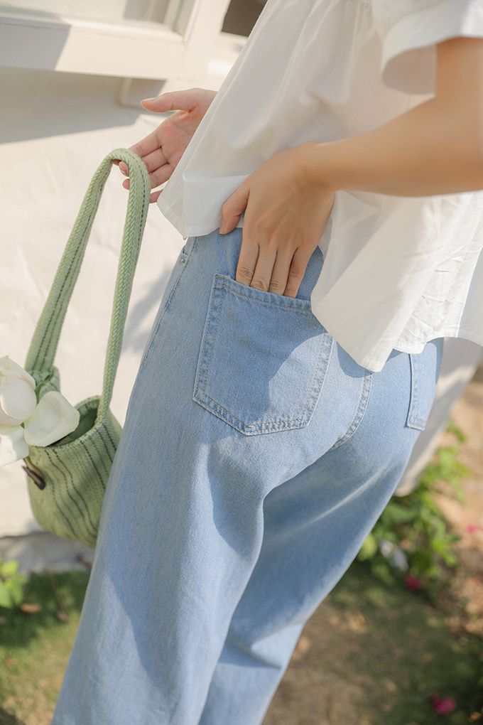 LANJÍN - 日系高腰荷葉下襬直筒牛仔長褲-淺藍色