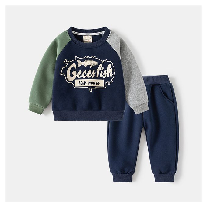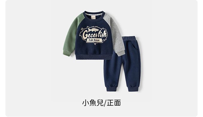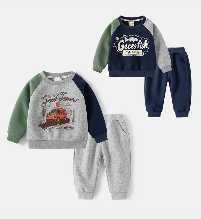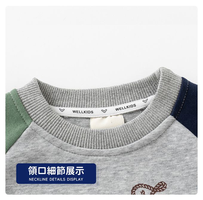 WELLKIDS - 圓領寬鬆運動服套裝-恐龍散步-藍+灰