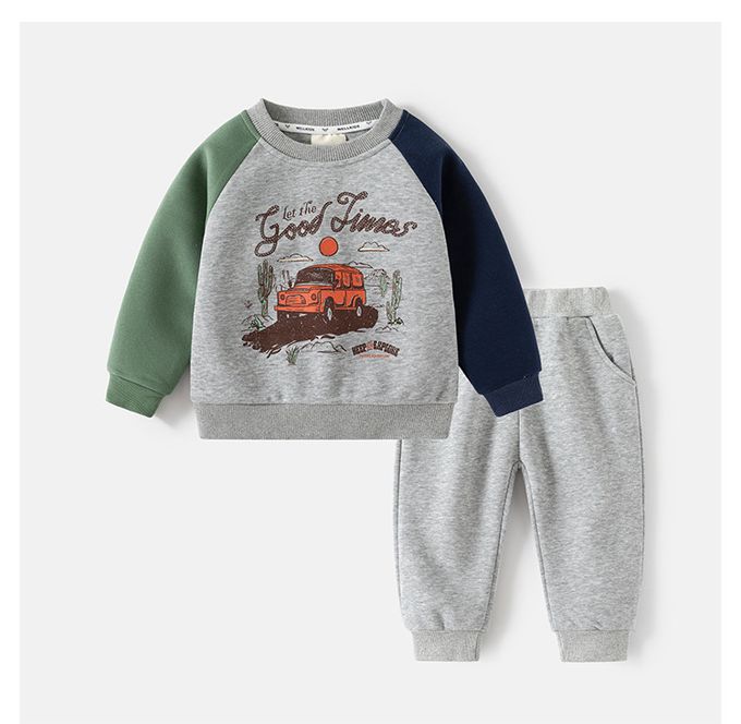 WELLKIDS - 圓領寬鬆運動服套裝-恐龍散步-杏+灰
