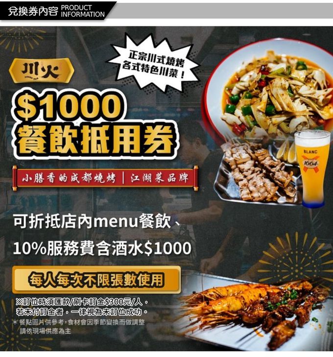 1.本券限於《川火 成都燒烤》內用,每人每次不限張數使用,抵用券優惠內容可折抵(店內menu餐飲、10%服務費含酒水)$1000,若餐飲服務總價值超過$1000,需於現場補價差使用額外服務。(優惠券金額不另開發票,若有補差額將另開發票)。
