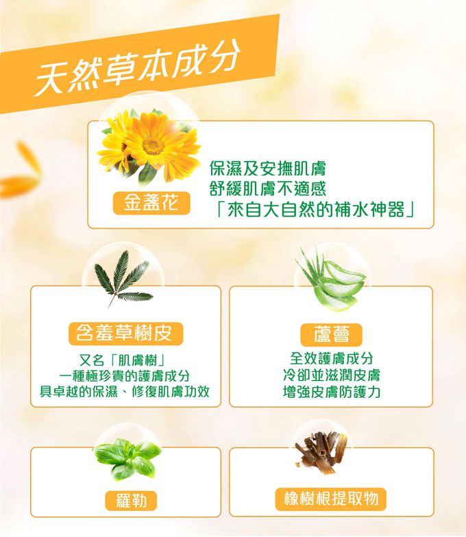 成分:金盞花、蘆薈、含羞草樹皮、羅勒、橡樹根提取物