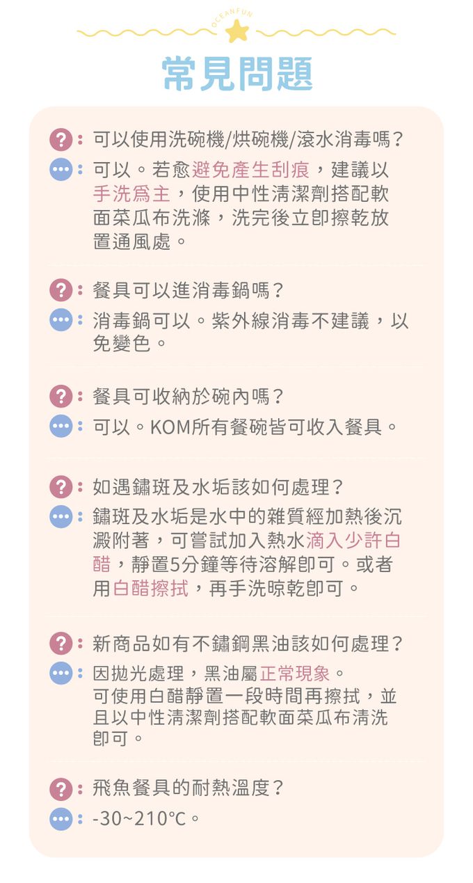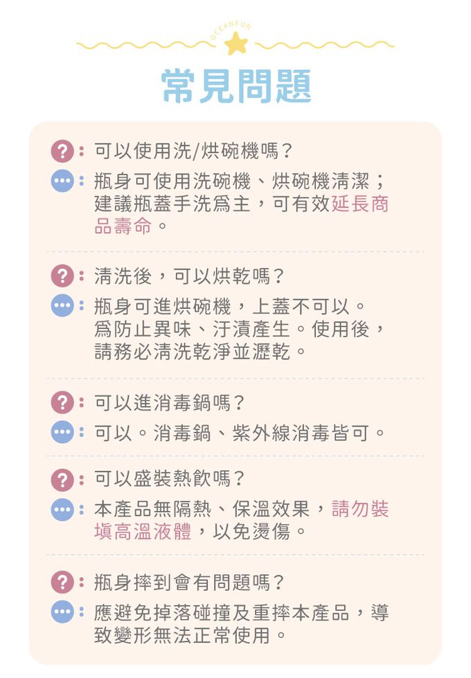 注意事項:1.清洗請使用中性洗碗劑,並以軟布或海綿刷洗,勿用鋼刷或菜瓜布以免刮傷。 2.請避免重摔或敲擊本產品,以免產品變形。 3.產品建議以手洗後擦乾並放置通風處為主,以延長商品壽命。 4.矽膠勿進紫外線消毒鍋,有變色風險。