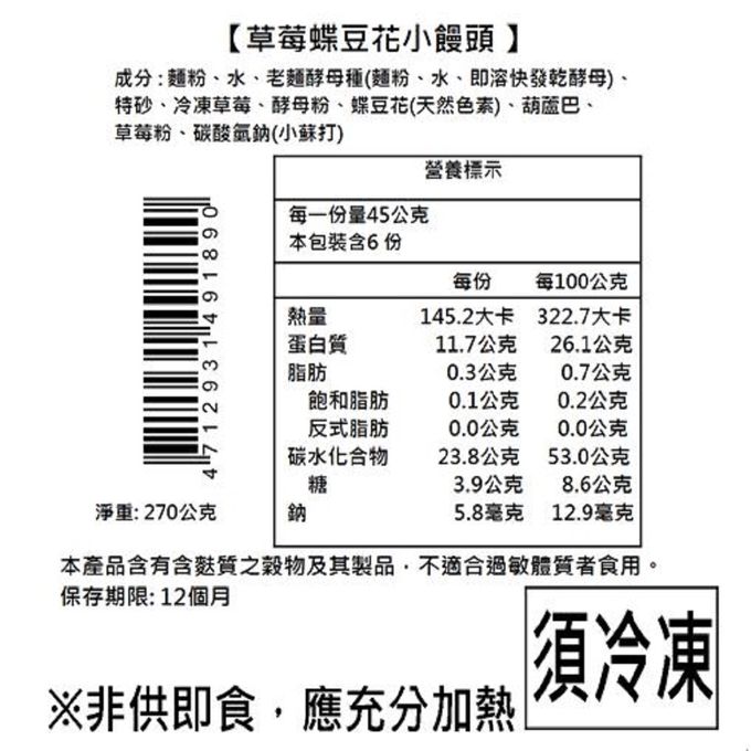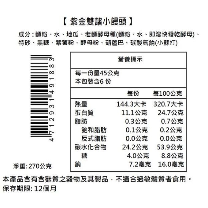 成分:紫金雙藷成分 :麵粉、水、地瓜、老麵酵母種(麵粉水即溶快發乾酵母)、特砂、黑糖、紫薯粉、酵母粉、葫蘆巴、碳酸氫鈉(小蘇打) 。 草莓蝶豆花成分 :麵粉、水、老麵酵母種(麵粉、水、即溶快發乾酵母) 、特砂、草莓、酵母粉、蝶豆花、葫蘆巴、草莓粉、碳酸氫鈉(小蘇打)。 小經典招牌成份:麵粉、水、老麵酵母種(麵粉、水、即溶快發乾酵母)、黑糖、葵瓜子、黑芝麻、南瓜子、枸杞、核桃、葫蘆巴、碳酸氫鈉(小蘇打)。 小沖繩黑糖成份:麵粉、水、老麵酵母種(麵粉、水、即溶快發乾酵母)、沖繩黑糖、葫蘆巴、碳酸氫鈉(小蘇打)。 鮮奶芋頭成分 :麵粉、鮮奶、芋頭、白糖、酵母粉、葫蘆巴。 鮮奶原味成分 :麵粉、鮮奶、特砂、奶粉、酵母粉、葫蘆巴。