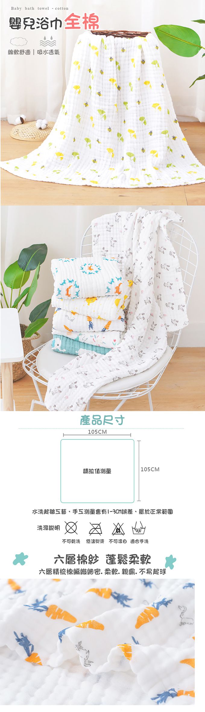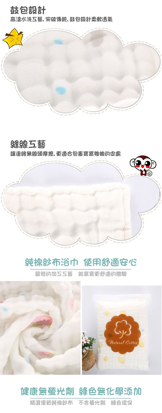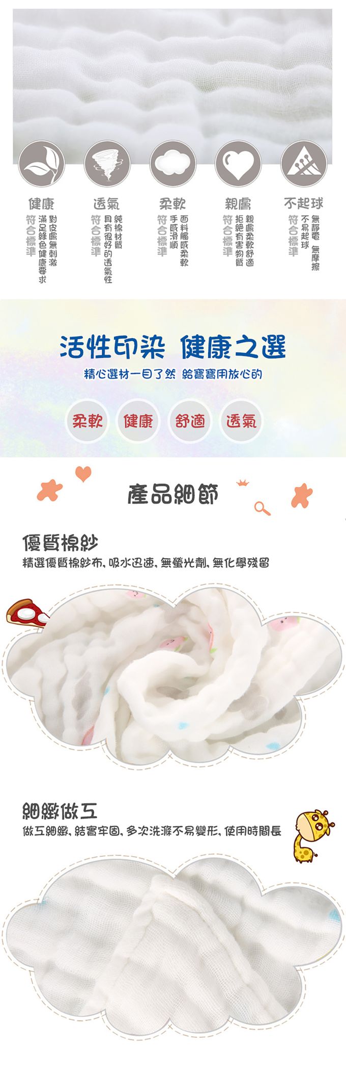 2.六層紗布製成,紗布是交織而成,可當洗澡巾、餵奶巾、口水巾、手帕等,用途多多