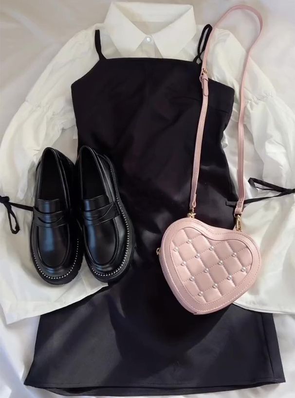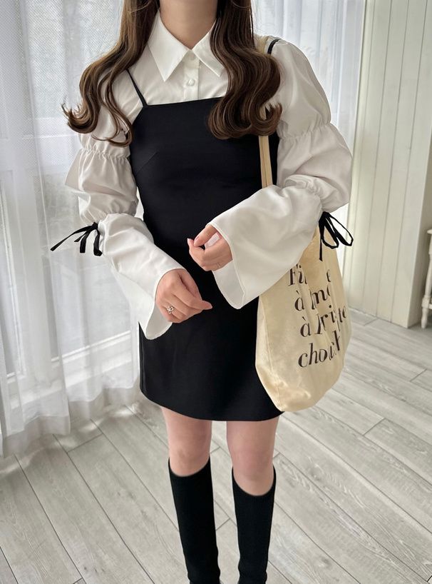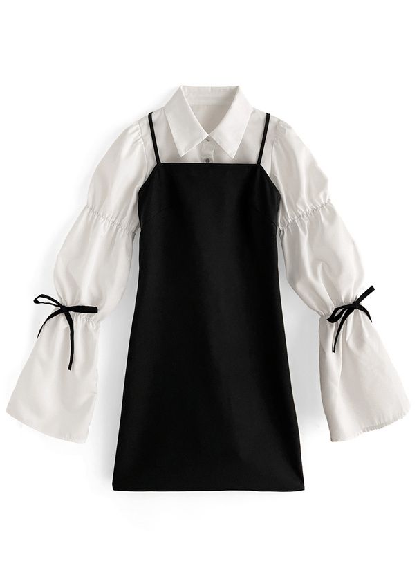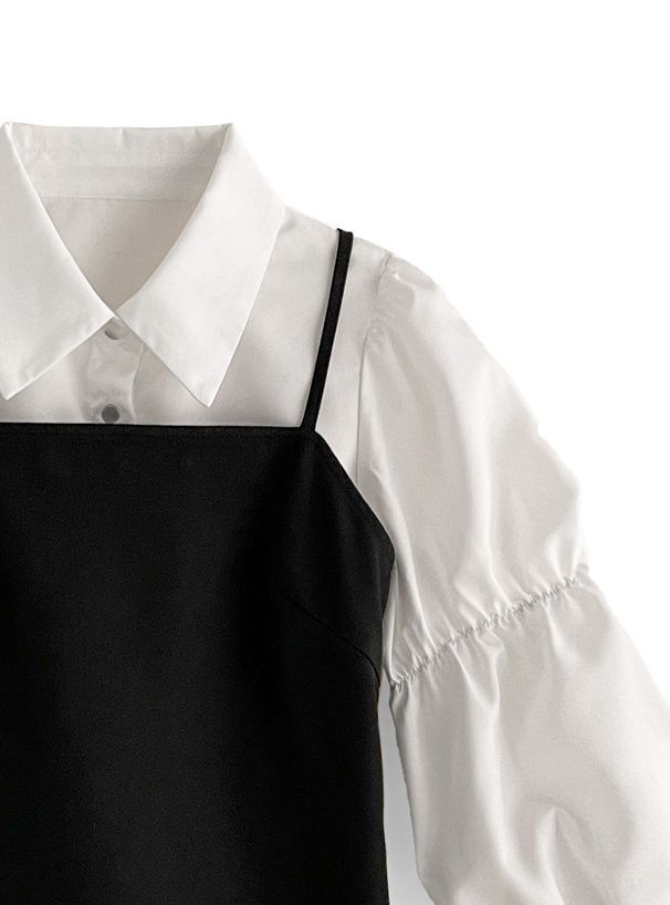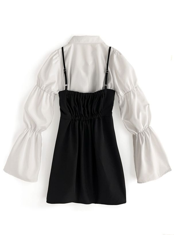 細肩帶+皺摺長袖襯衫式短洋裝(2件組)