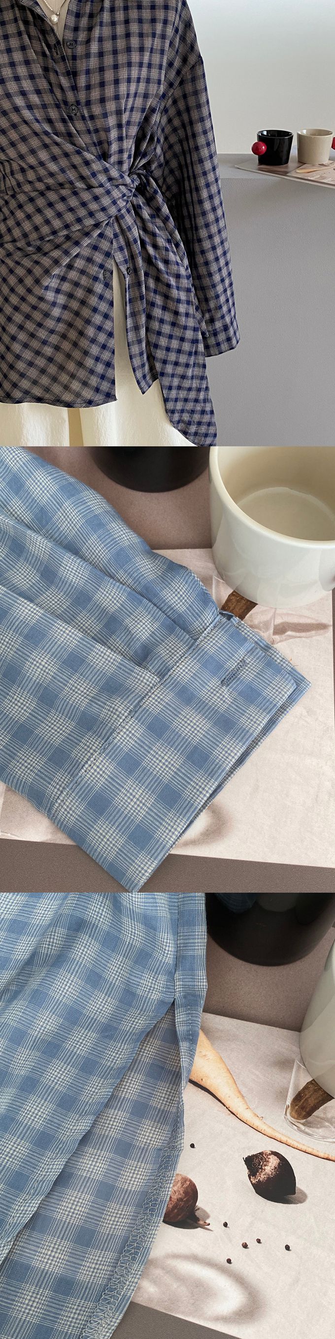 品名:純棉腰繫帶設計感開衩格子長袖襯衫