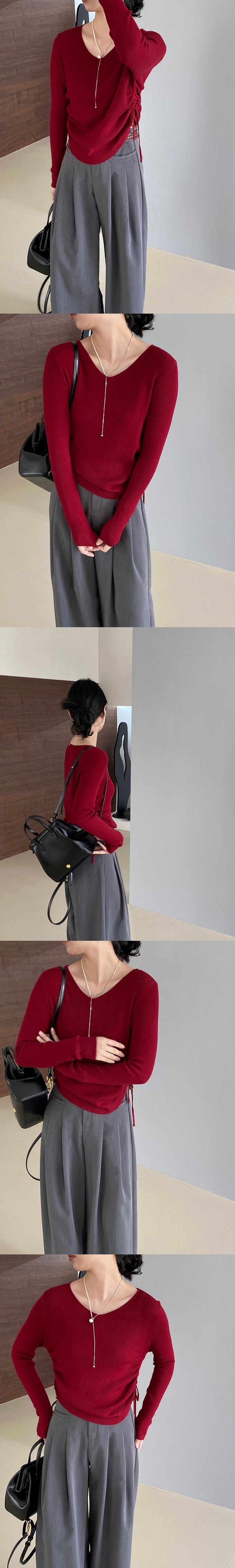 抽繩設計顯瘦百搭長袖羊毛針織上衣-酒紅色 (F)