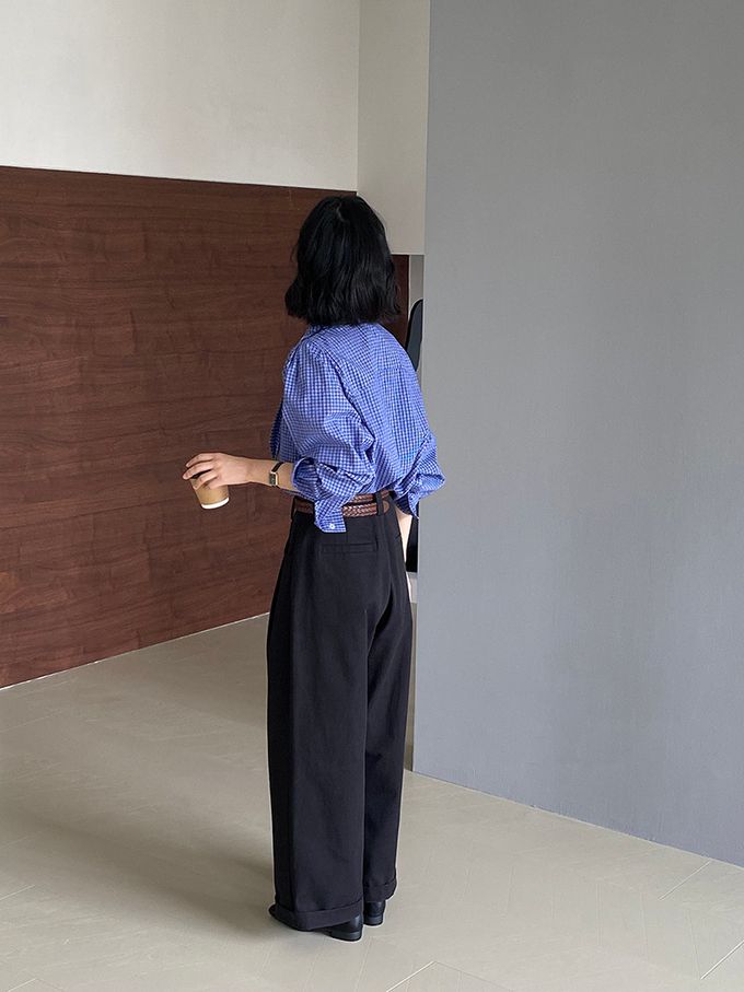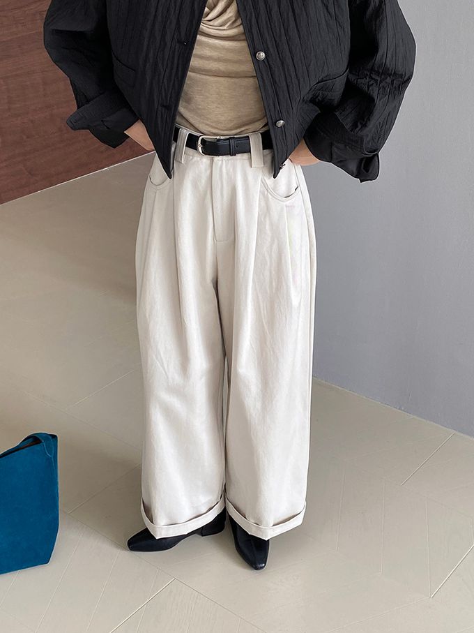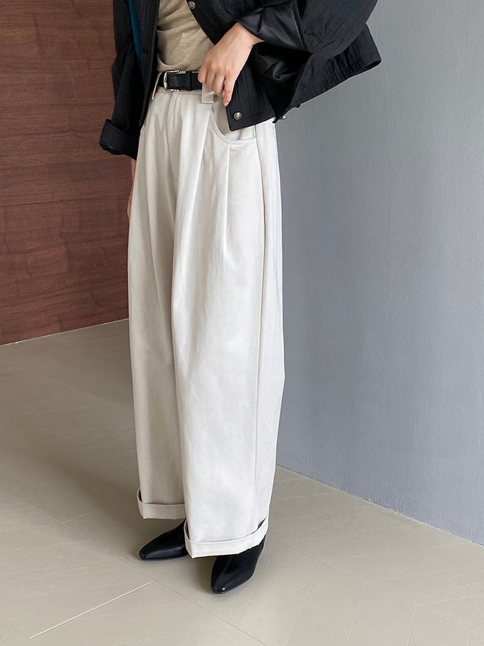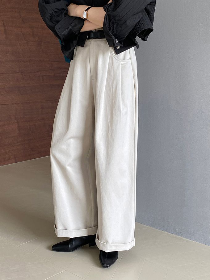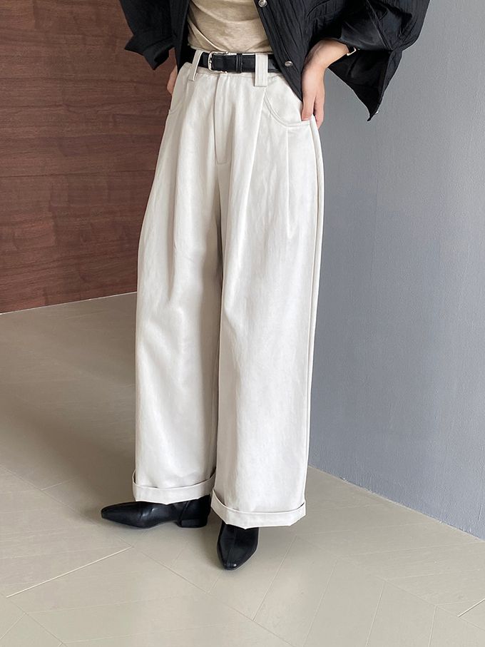 天絲百搭高腰寬鬆修飾休閒長褲-灰白
