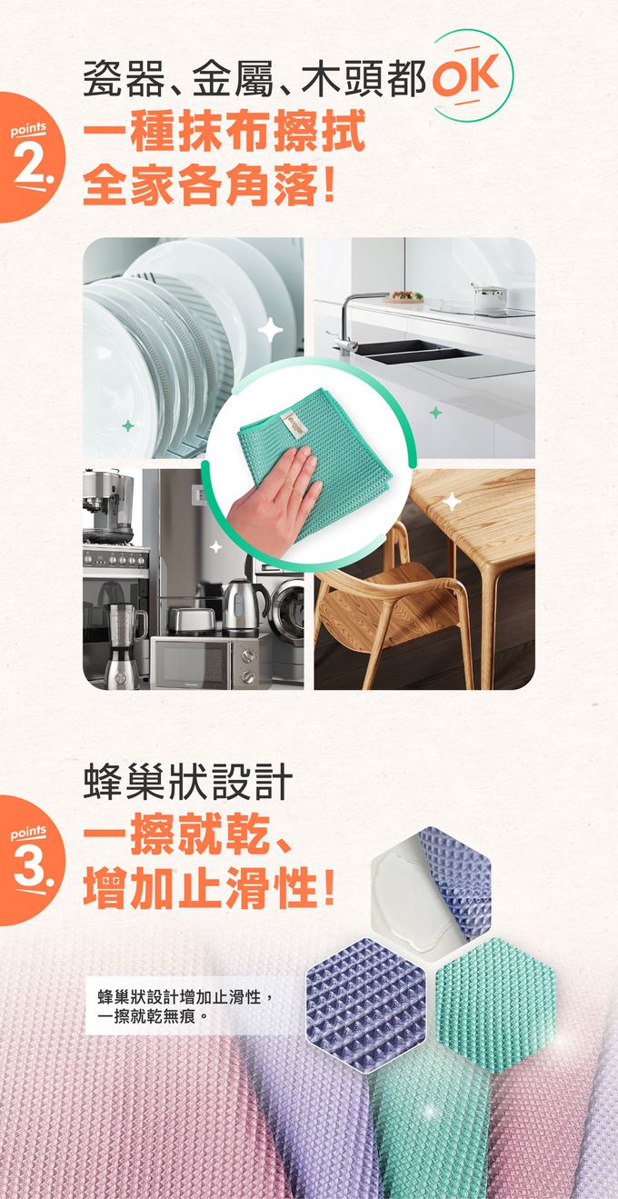 材質:魔吸HO KEEP-A+蜂巢抗菌家事布(75%聚酯纖維+25%尼龍)/薄型菜瓜布-聚酯纖維/