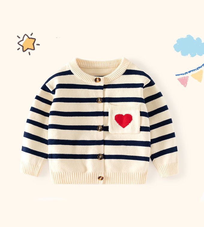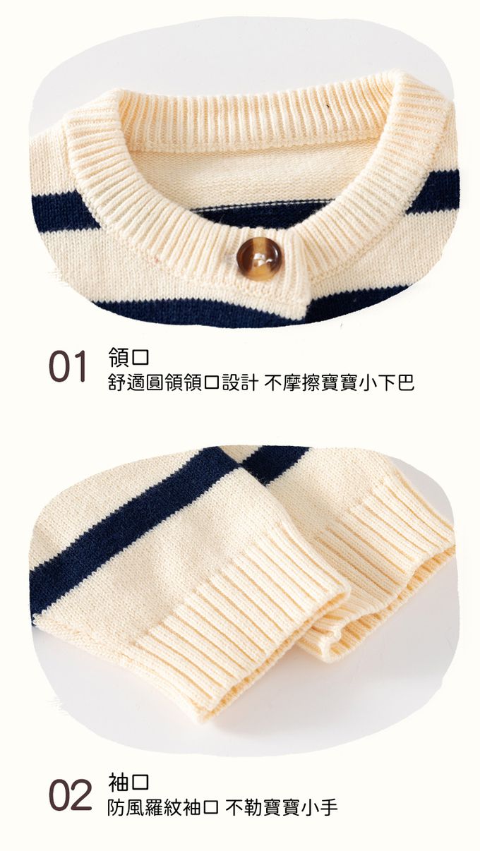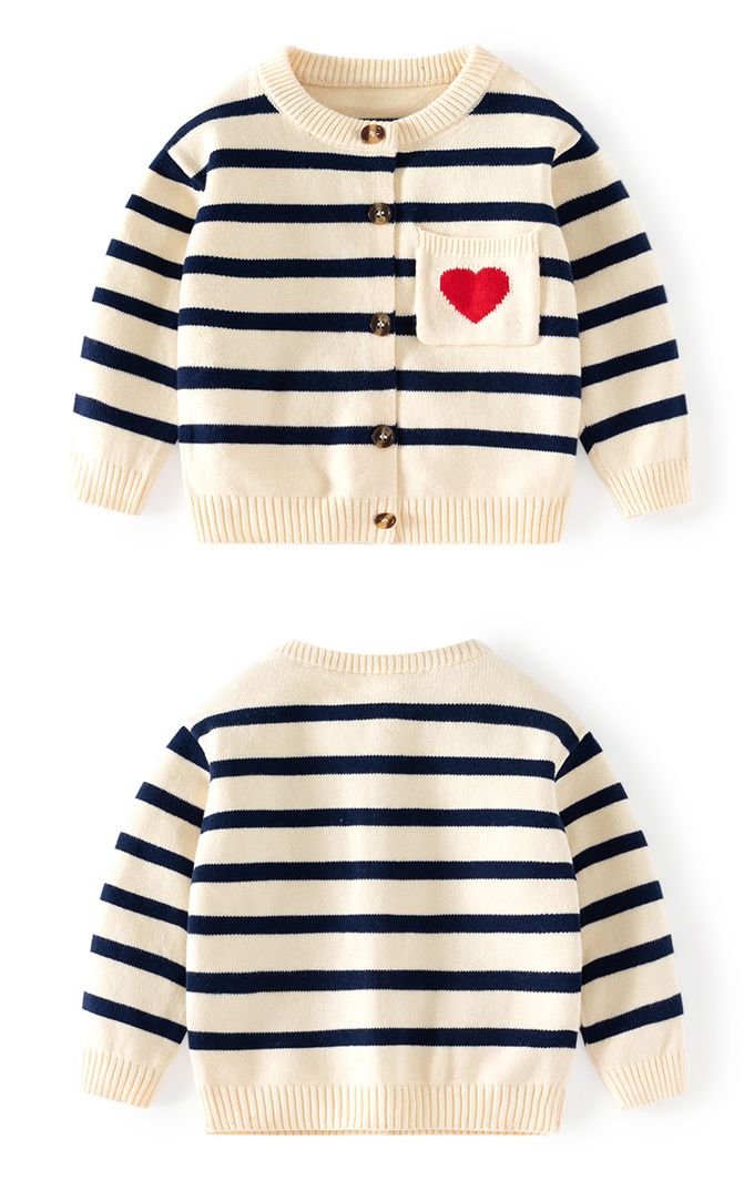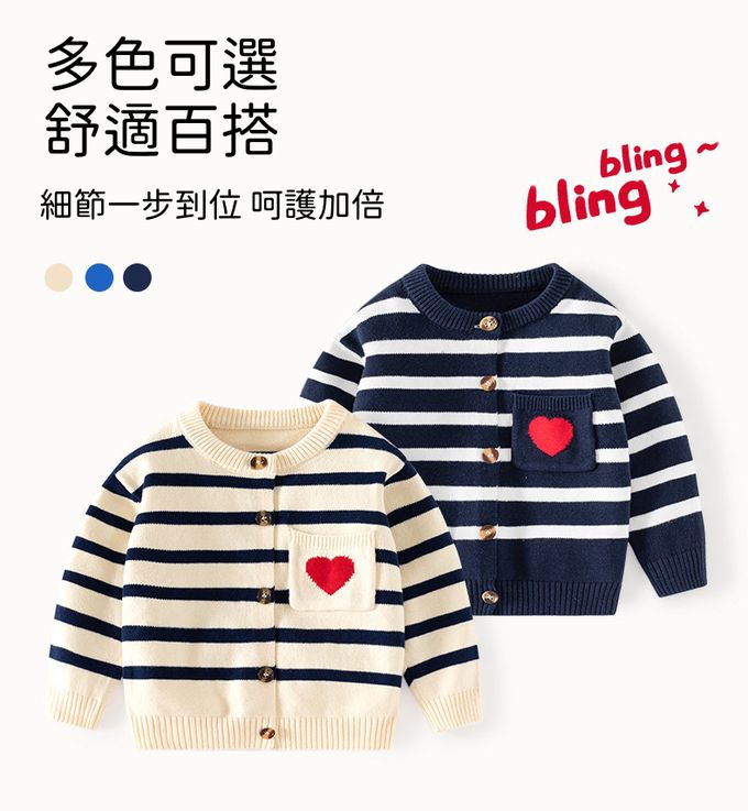 舒適圓領針織排釦外套-條紋愛心-藍色