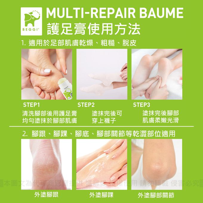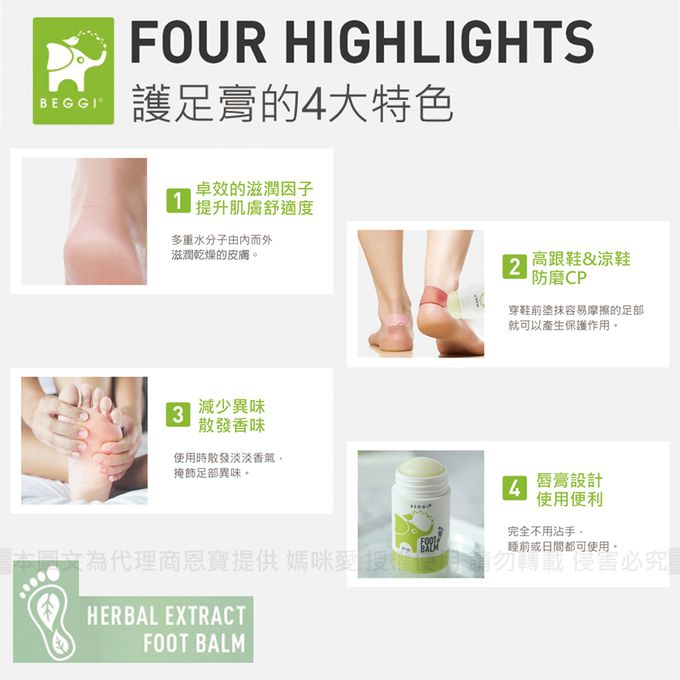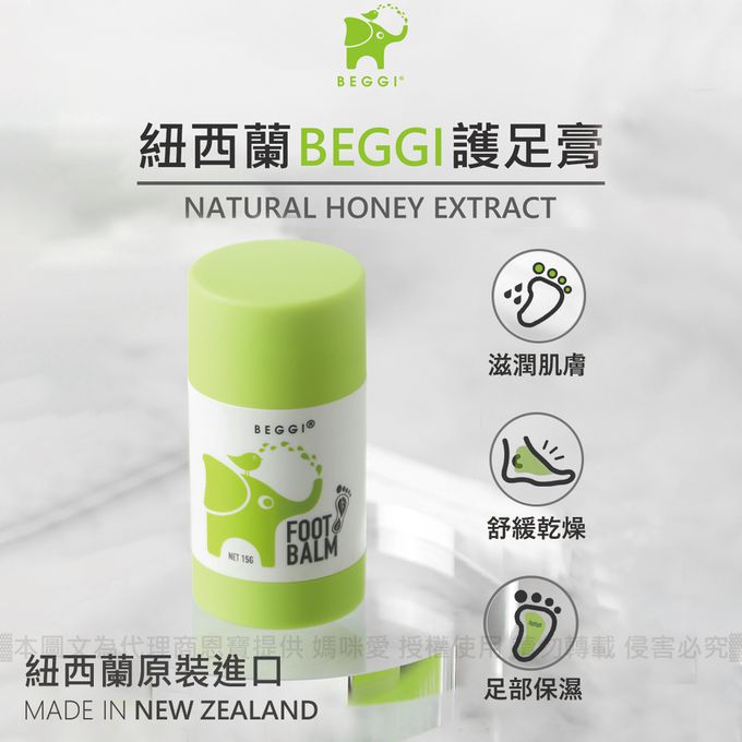紐西蘭BEGGI護足膏,成分採用草本及蜂蜜萃取物而製成,草本萃取物可以讓我們的足部肌膚持續保持滋潤,而蜂蜜萃取物則是舒緩我們足部肌膚的乾燥,也更因為產品本身帶有蜂蜜的香氣,在塗抹後也可掩飾我們腳底所散發的異味。