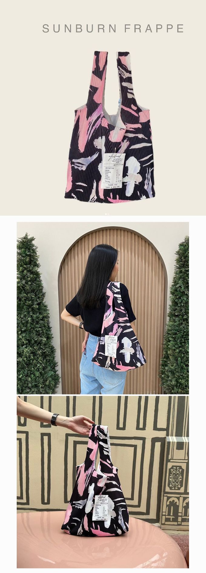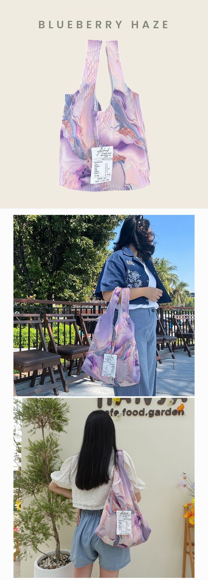 成分:尺寸:全長56寬40 底寬10 cm 手提長度20CM 開口:無 (開放式) / 內袋:無 材質:聚脂纖維皺褶布 重量:95g 顏色:B-1/B-2/B-3/B-4/B-5/B-6/B-7 泰國自有品牌的在地手工包,獨特布料的渲染花色很美,不會輕易撞包,花色選擇眾多,容量充足,不管當通勤背袋或是購物包都非常實用,布料柔軟又輕巧,可折疊收納不佔空間,時尚好搭衣服! 保養方式: ① 將中性洗潔劑擦於髒污處,使用軟刷沾水順著布紋輕輕刷洗。 ② 重複多次,直至泡沫蓋滿污垢後淡化污垢。 ③ 切忌不可用力刷洗,以免布料出現起毛現象會弄傷布料。 ④ 可用小火熨燙延長包包的使用壽命(須依皺褶紋路熨燙)。 ⚠️渲染包為手工製作,渲染分佈會有變化實屬正常