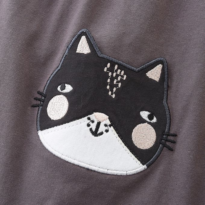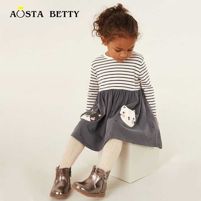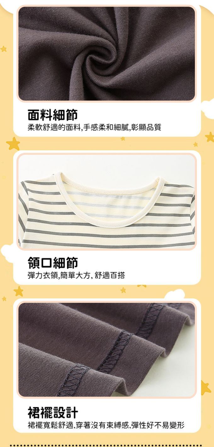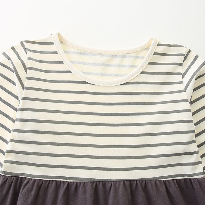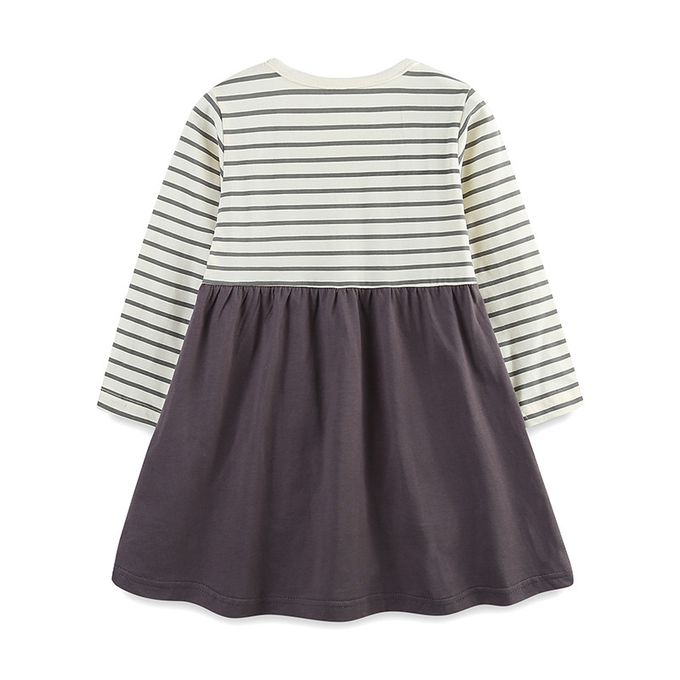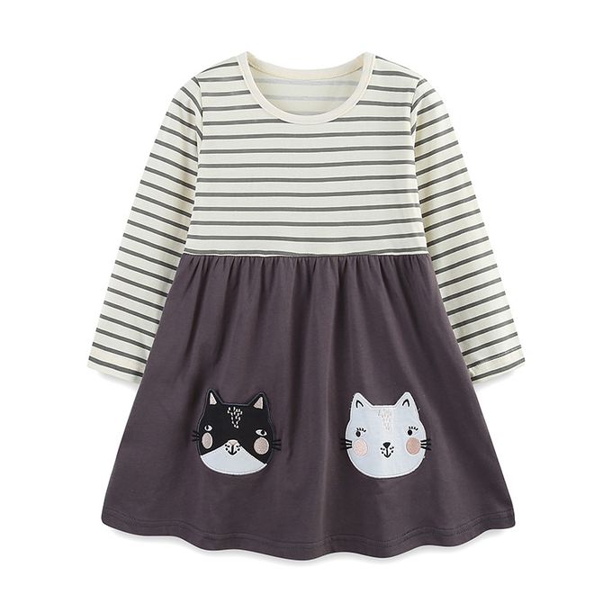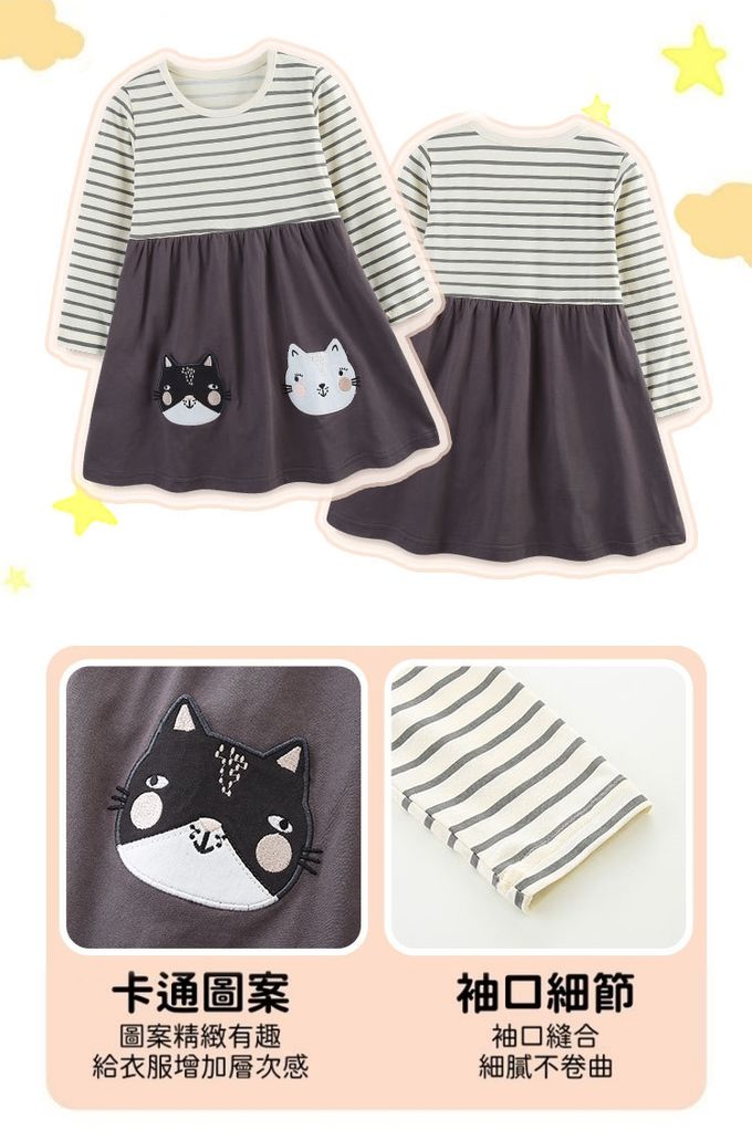 純棉圓領拼接長袖洋裝-兩隻小貓-灰色條紋