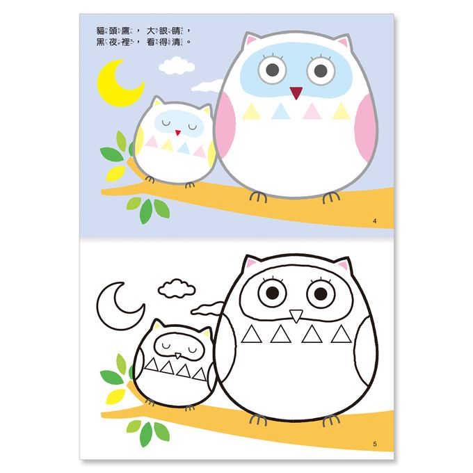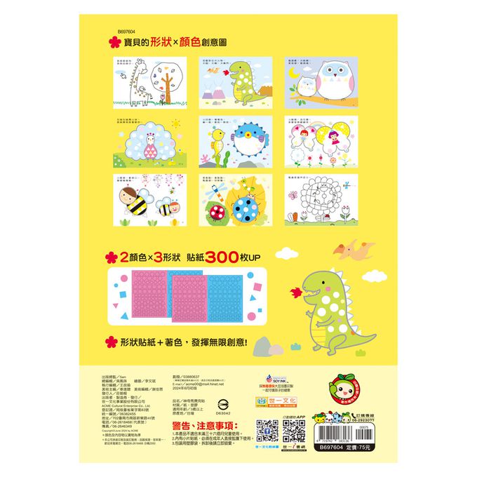 依照圖案指示把形狀貼紙貼上去,沒有上色的部份也可以自己上色讓圖案更完整!每本都有超過200張貼紙,讓寶貝發揮無限創意!