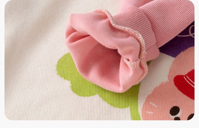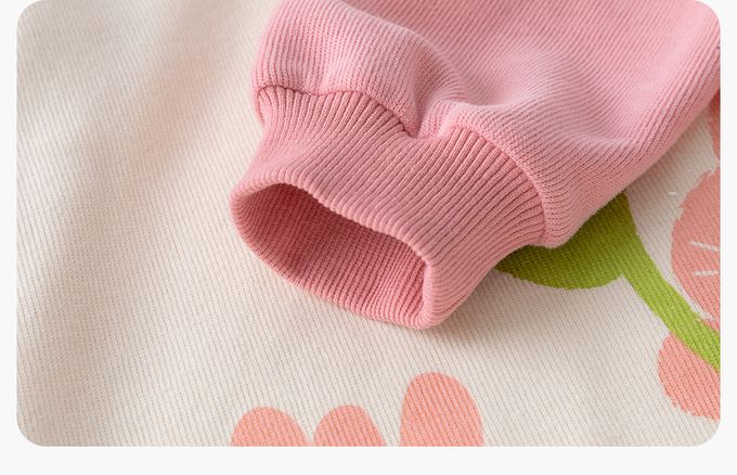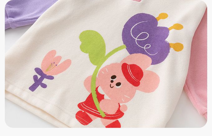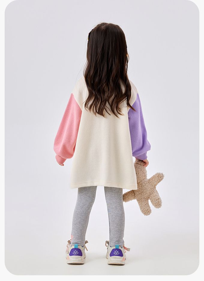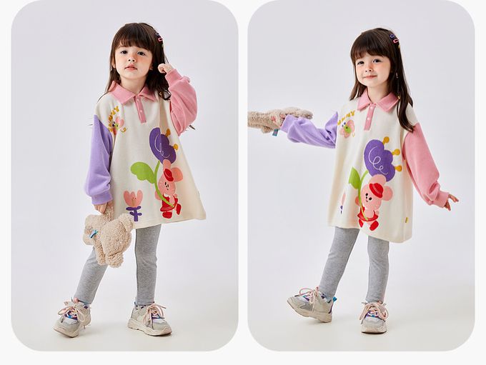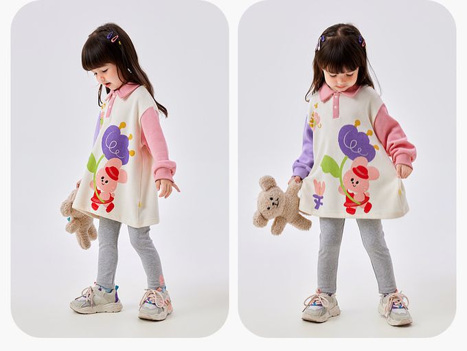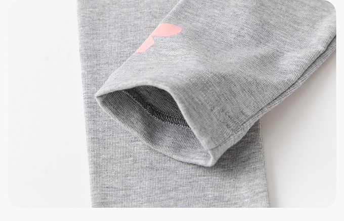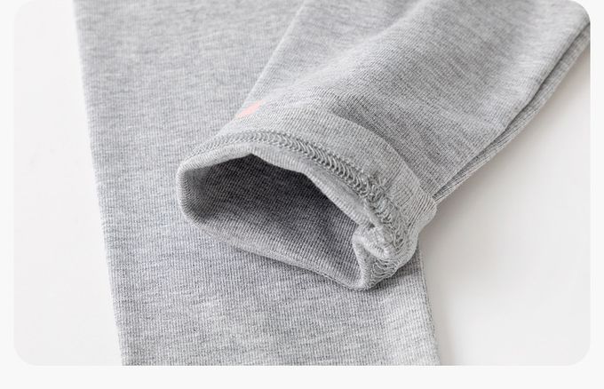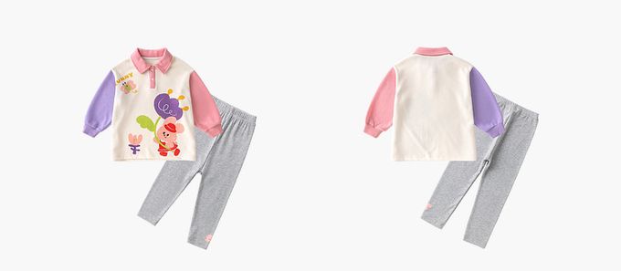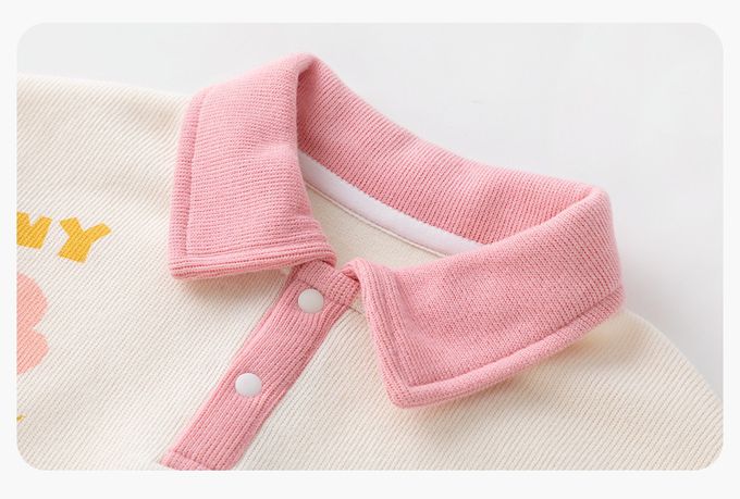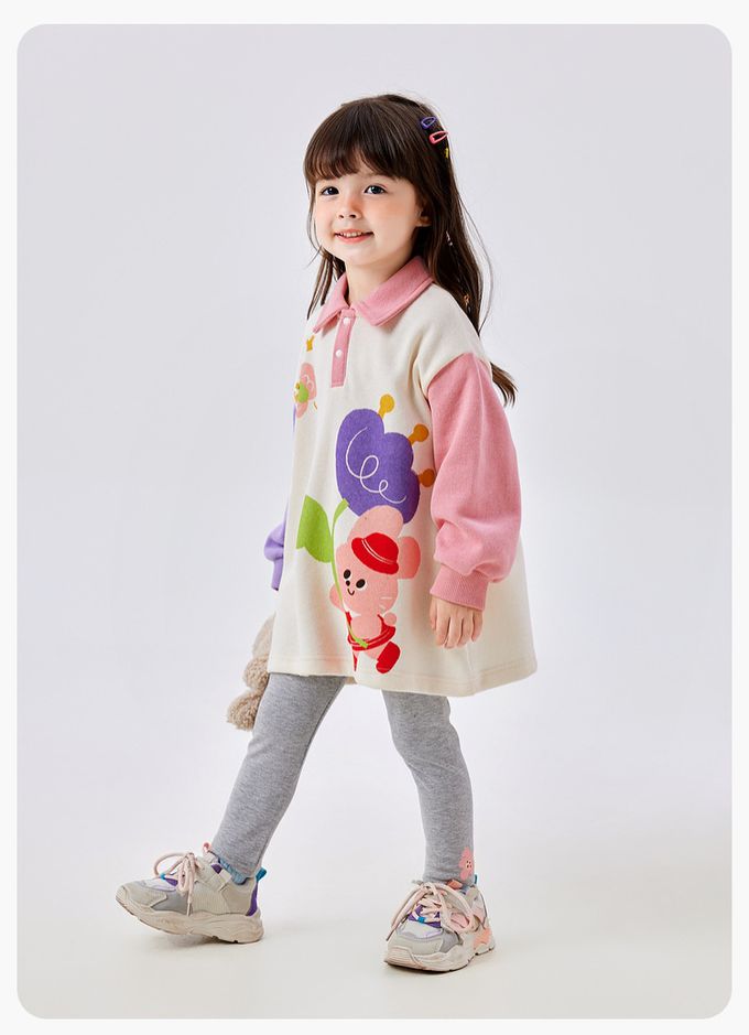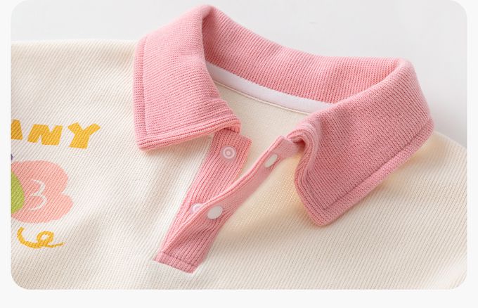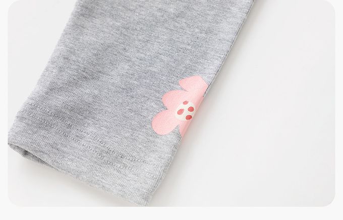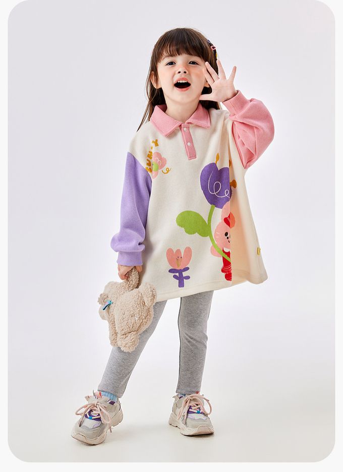 中長版polo領長袖上衣+內搭褲兩件組-兔兔與花朵-米白+灰