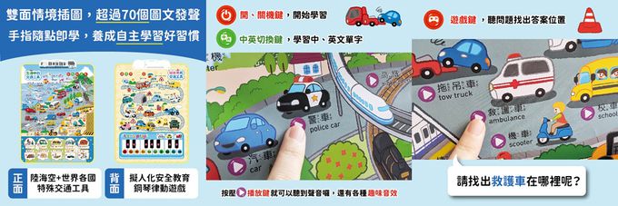 - 手指點讀可學習交通工具的中英雙語認知名稱;還可以聽見特殊音效;點讀情境對話按鍵能夠聽見擬人化的生活語音來認識不同車子的特色。