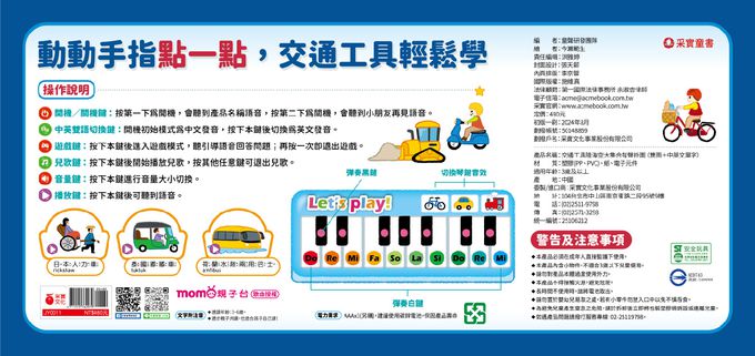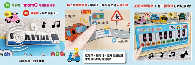 - 背面上半部以擬人化的交通工具呈現,搭配與場景互動的情境語音,還有生活常見的安全標誌,幫助孩子建立基本的交通安全觀念。