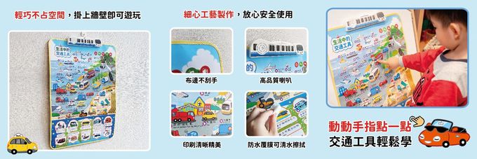 ★超過50項的常見+特殊交通工具、15項情境對話與交通安全語音,幫助孩子們邊玩邊學!