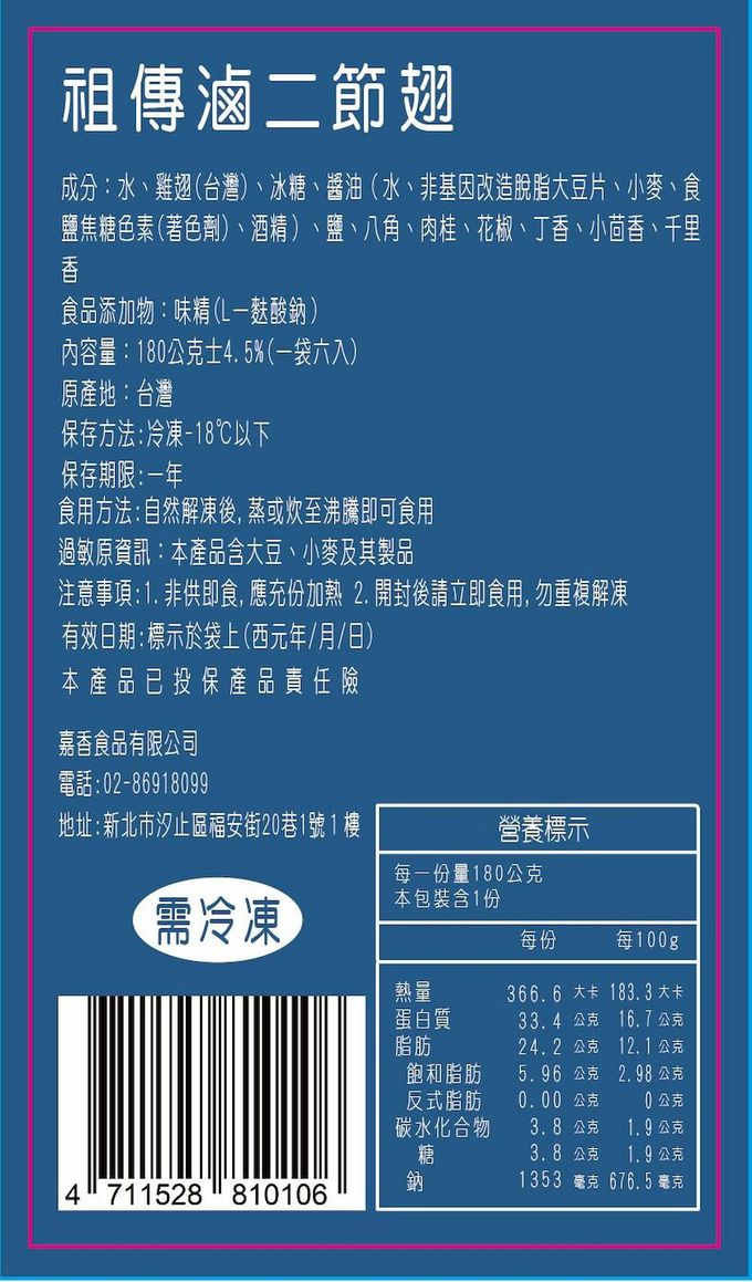 成分:水、雞翅(台灣)、冰糖、醬油(水、非基因改造脫脂的豆片、小麥、食鹽、酒精、(氮、胺基態氮、無鹽可溶性固形物))、鹽、八角、肉桂、花椒、丁香、小茴香、千里香