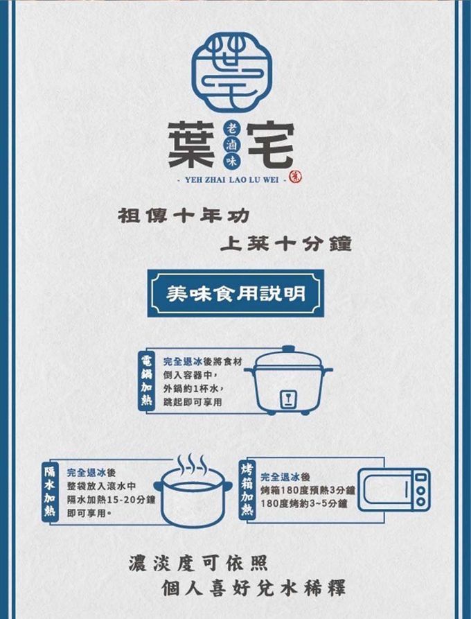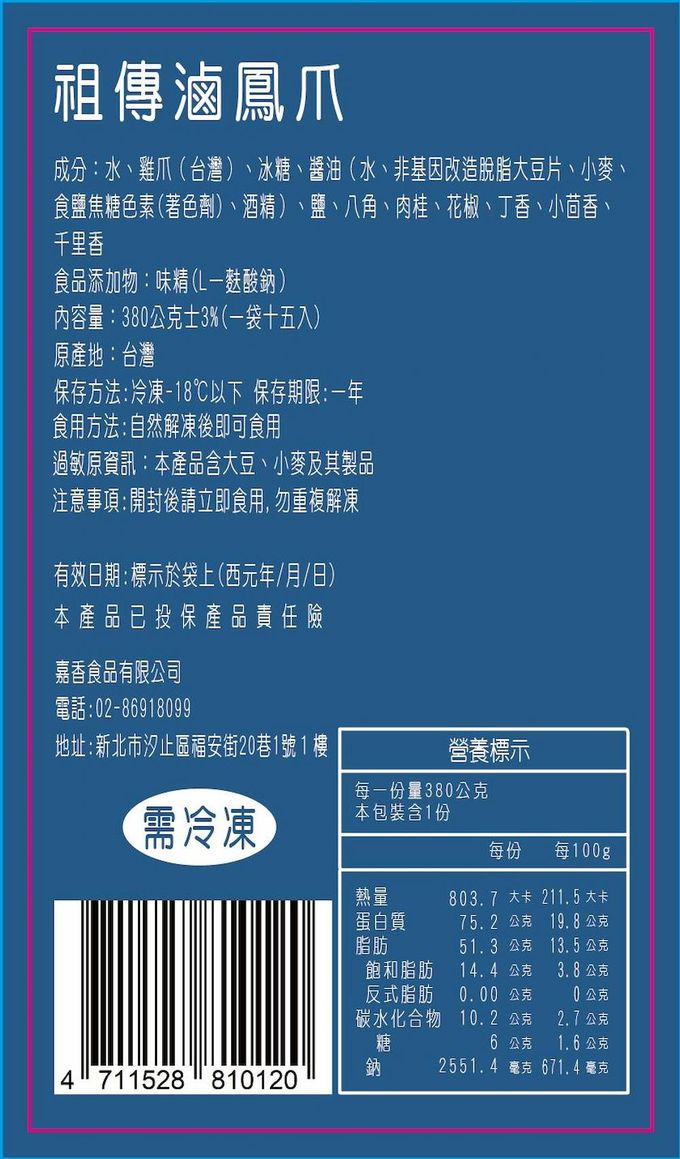 成分:水、雞爪(台灣)、冰糖、醬油(水、非基因改造脫脂的豆片、小麥、食鹽、酒精、(氮、胺基態氮、無鹽可溶性固形物))、鹽、八角、肉桂、花椒、丁香、小茴香、千里香
