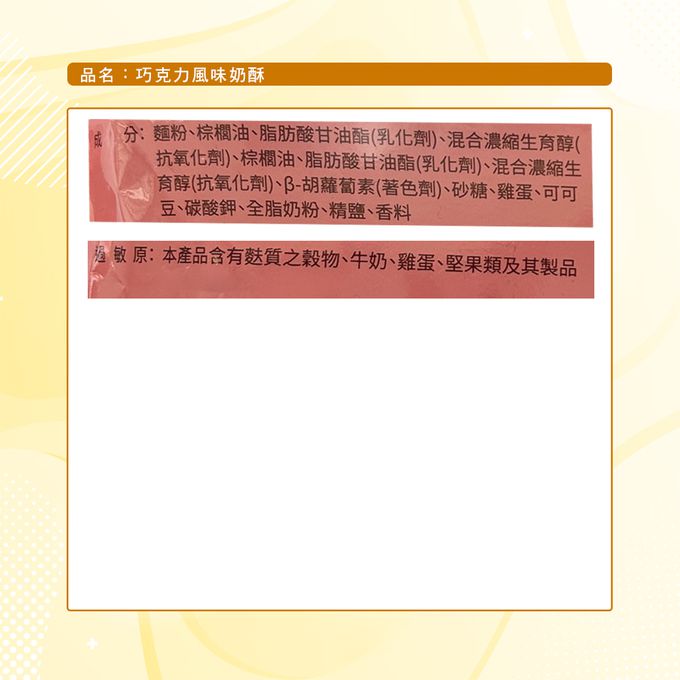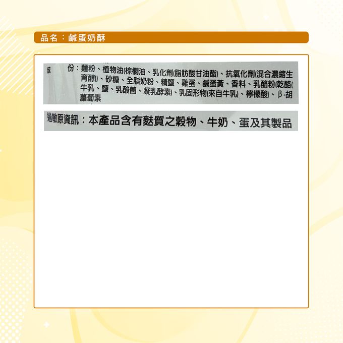 過敏原:本產品含有麩質之穀物、牛奶、雞蛋、堅果類及其製品