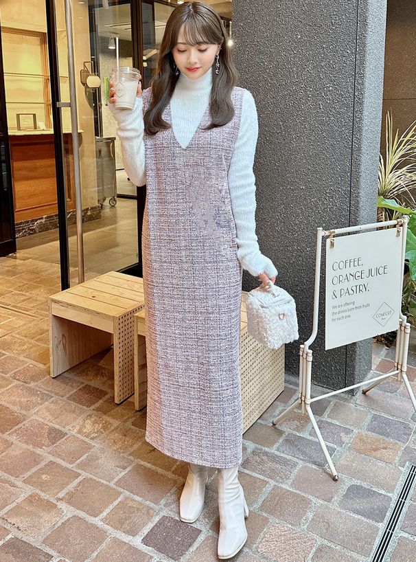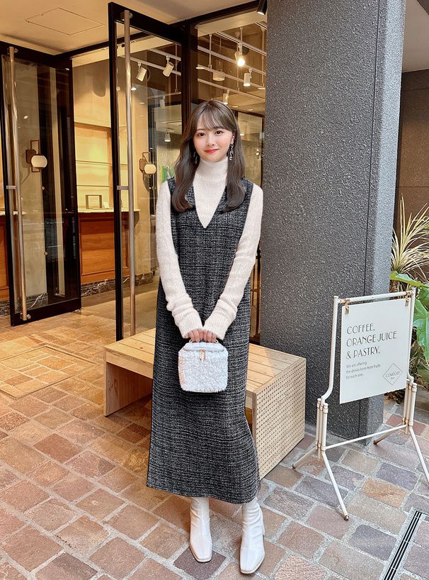 日本 GRL - V領千金小姐花呢背心洋裝-黑 (F)