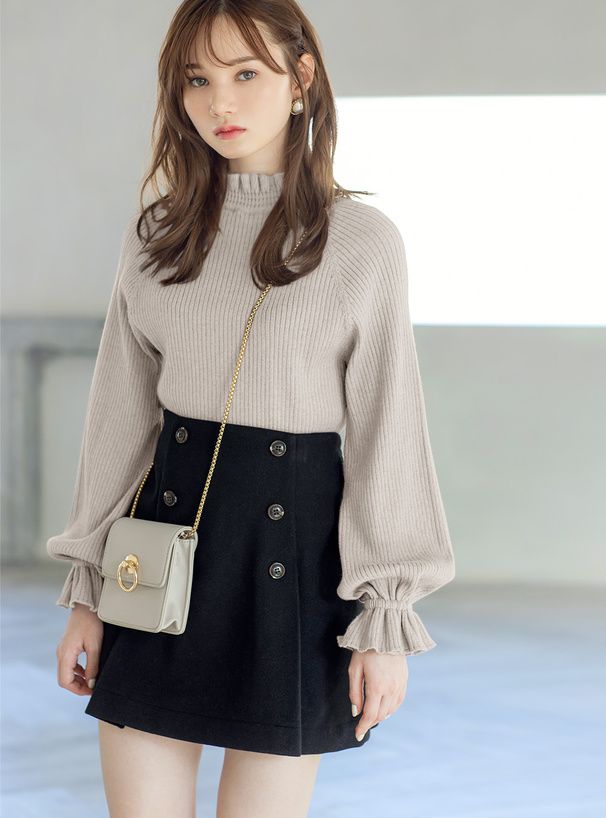 日本 GRL - 糖果袖荷葉領針織上衣-淺灰杏