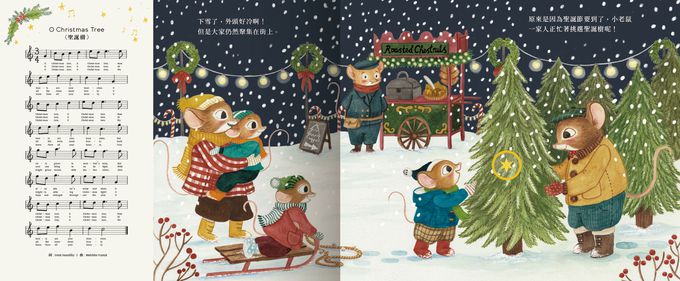 ★故事和音樂結合更豐富: 收錄八首一定聽過的聖誕歌謠 每個故事頁都搭配一首聖誕歌謠,按下書中的星星按鍵,就能聽見曲子最耳熟能詳的段落。悠揚音色再搭配小老鼠和家人們在聖誕佳節前所發生的趣事,讓人彷彿沉浸在溫馨又迷人的音樂饗宴裡! 本書收錄八首聖誕歌謠,分別為: 〈聖誕樹〉 〈我們祝你聖誕快樂〉 〈聖誕鈴聲〉 〈裝飾大廳〉 〈聖善夜〉 〈平安夜〉 〈紅鼻子馴鹿魯道夫〉 〈普世歡騰〉