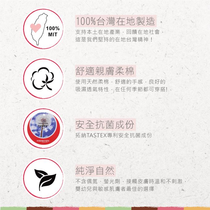 -新生兒親膚衣物(嬰幼兒包巾與背巾、包屁衣、學習褲、紗布衣等)。