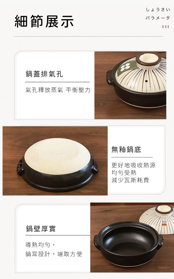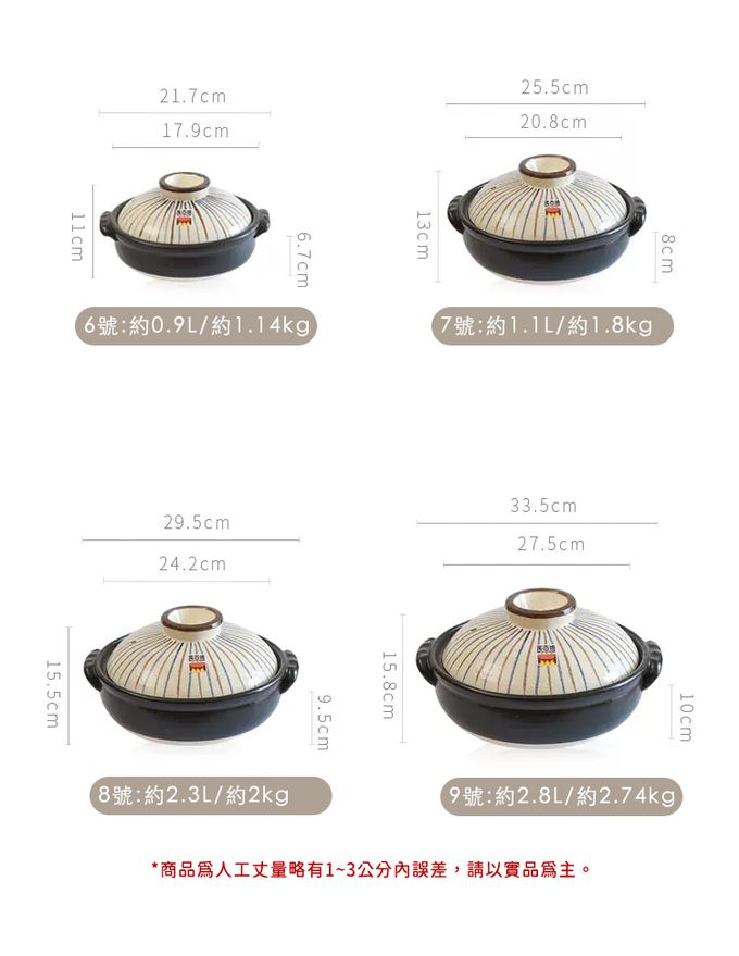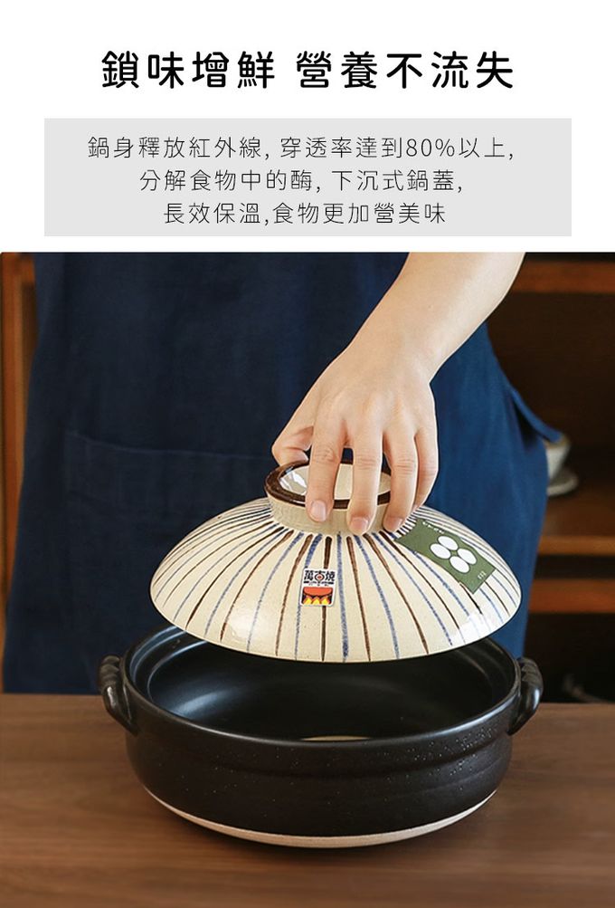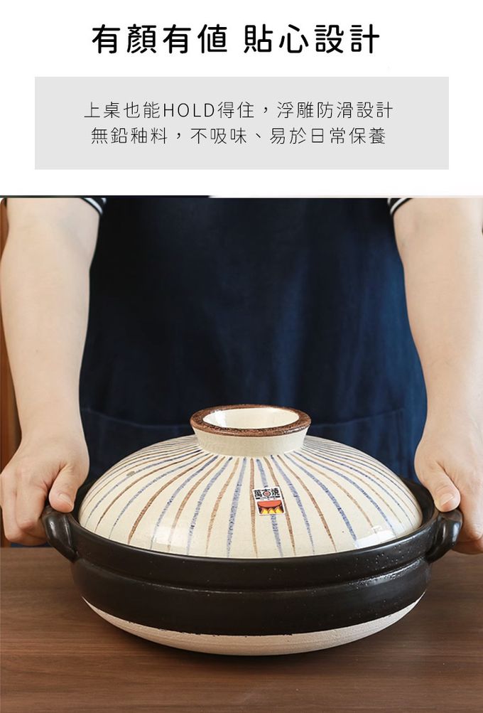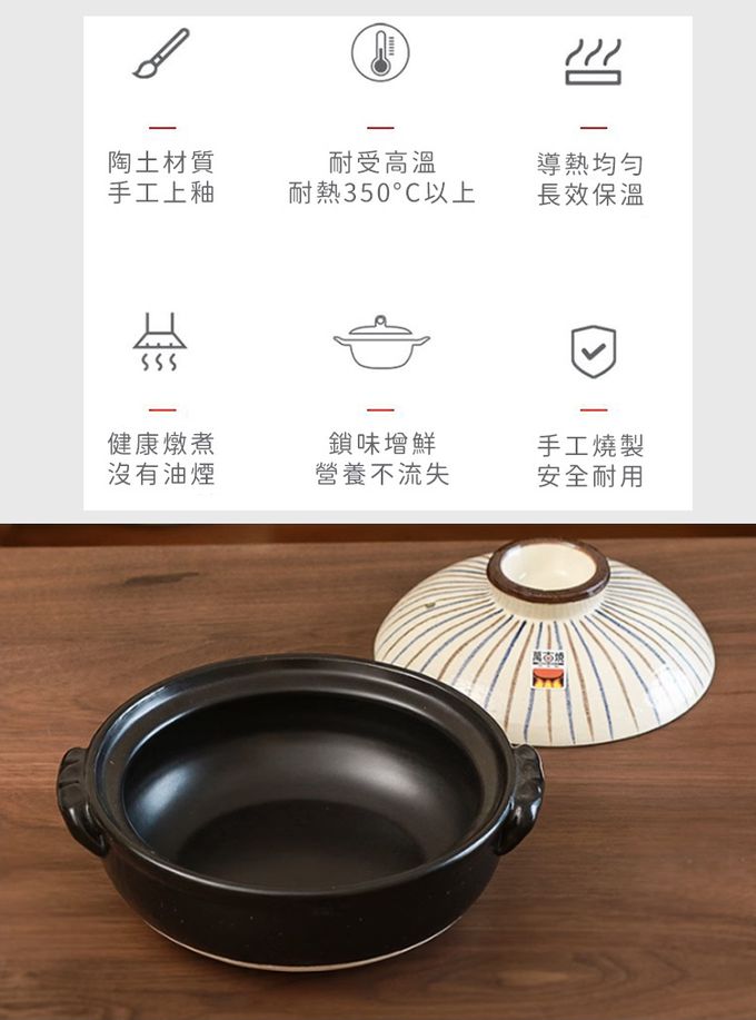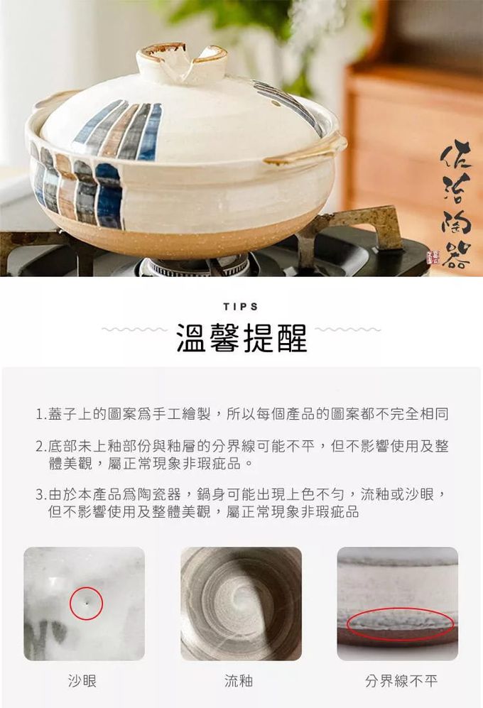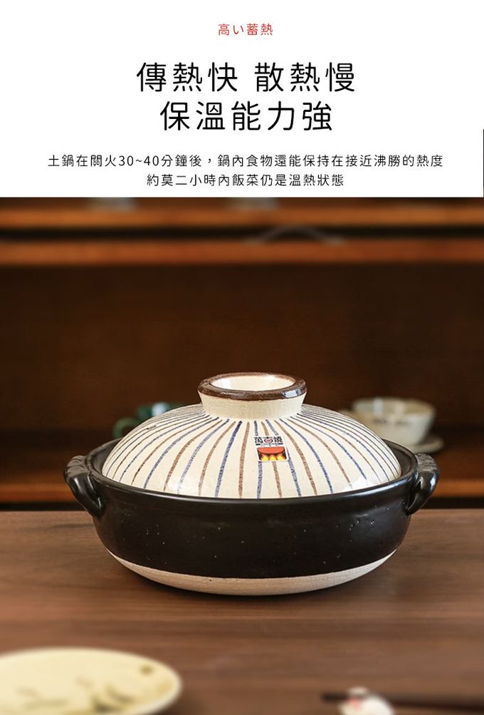 注意事項:注意事項 1.商品到貨享鑑賞期之權益,鑑賞期並非試用期,辦理退貨商品必須是全新狀態且紙箱及商品配件包裝須完整。商品一經使用或組裝後,恕無法辦理退換貨。 2.網頁商品會因面板螢幕解析度不同,造成圖片顏色呈現略有不同,請以實品顏色為準。 3.商品為人工丈量略有1~3公分內誤差,請以實品為主。 4.商品收到時若有破損或裂痕,請勿使用,並請在24小時內向購買平台反映商品狀況。 5.商品圖為情境示意圖,本商品內容不包含擺飾物品。 6.清洗擦拭後,請放置於通風處自然晾乾。 7.請放置於通風乾燥處,遠離過於潮濕地方。 8.清洗過程中,請使用中性清潔劑、海綿或抹布擦拭,請勿使用粗糙用品清潔,造成表面刮痕。 9.適用直火/微波爐/;不適用IH爐/烤箱 10.請勿空燒 11.請勿使用於油炸食物,炸油可能會滲入鍋內,造成不好的氣味避免溫差過大 12.鍋子應於小火開始加熱,若在冷卻的狀況下突然以大火加熱,底部接觸火源的地方容易因為溫差過大而裂開。 應以中小火慢慢溫熱整個鍋子,放入食材後再轉大火,因為鍋子的蓄熱性佳、受熱均勻,食材加熱後可以轉回中小火, 讓餘溫烹煮即可。 13.鍋子底部會與爐火直接接觸,長期下來會變黑,是正常現象 14.若鍋子是連同吃不完的食物一起放入冰箱冷藏,隔天要重新加熱時,不能把冰冷冷的鍋子直接放到瓦斯爐上開火, 應該要先置於室溫下稍微回溫再加熱。不過因為鍋子會吸收味道,所以建議不要長時間將食物或湯汁存放於其中。 15.烹煮完、還殘留熱度的土鍋不要直接放入水槽中沖水,先靜置在檯面上讓它冷卻再清洗。 16.若擔心油汙不好刷洗,可先用適量的溫熱水稍微浸泡;注意不要用洗碗精水浸泡,防止洗潔劑殘留。 17.土鍋有著受熱均勻、保溫持久的特性,所以移動時一定要使用隔熱手套,否則容易造成燙傷。 18.熱騰騰的土鍋也不能直接在放桌麵或濕抹布上,務必多一層隔熱墊,防止龜裂。