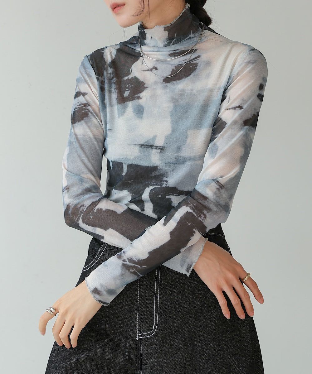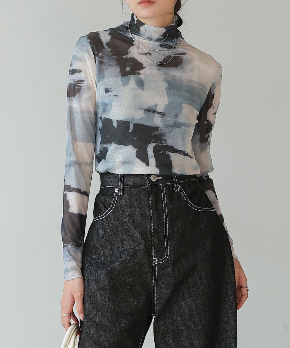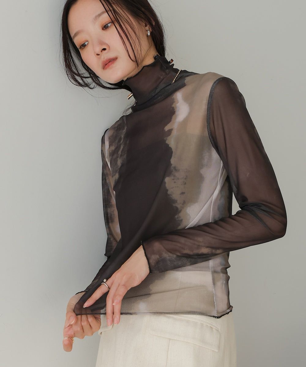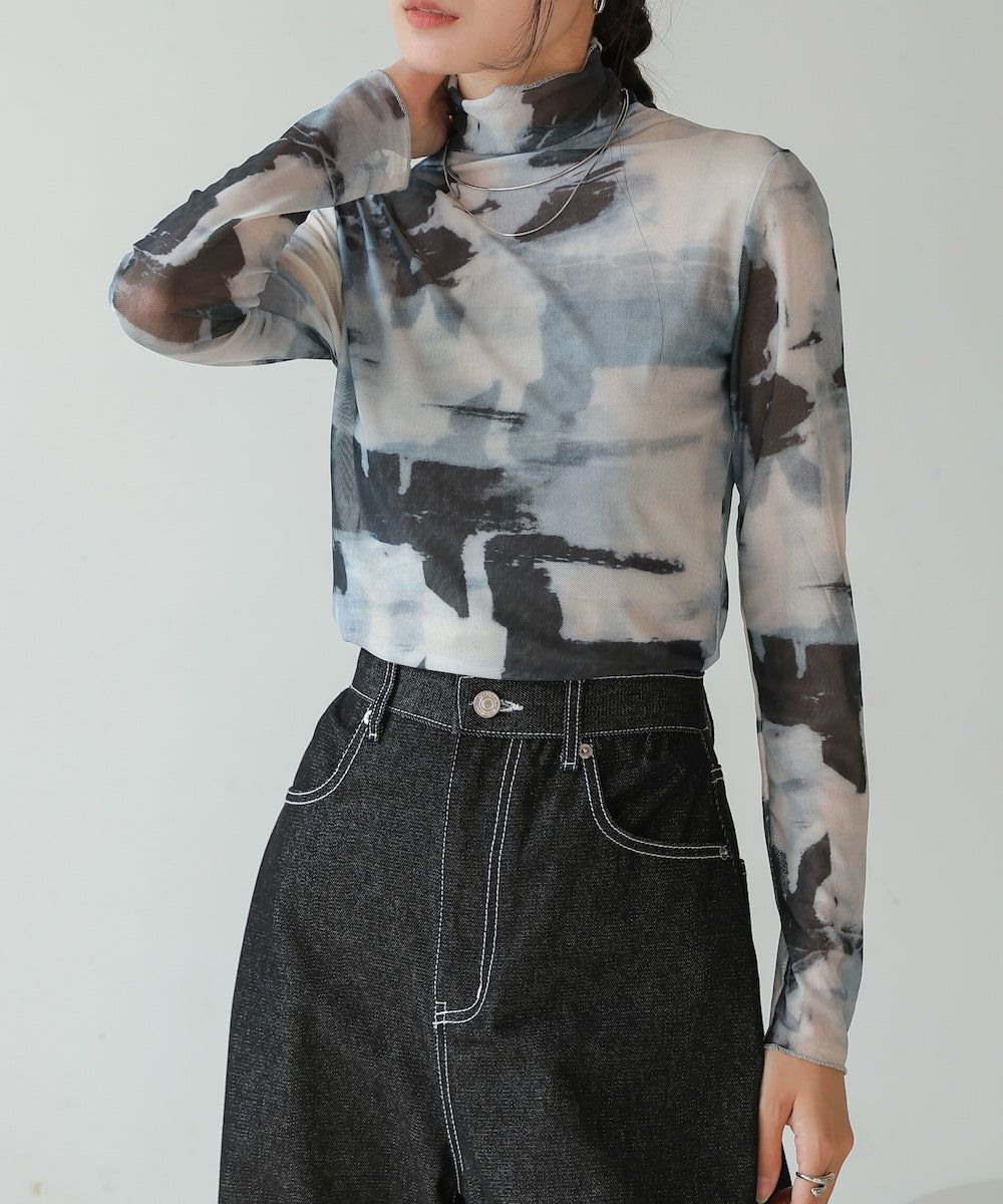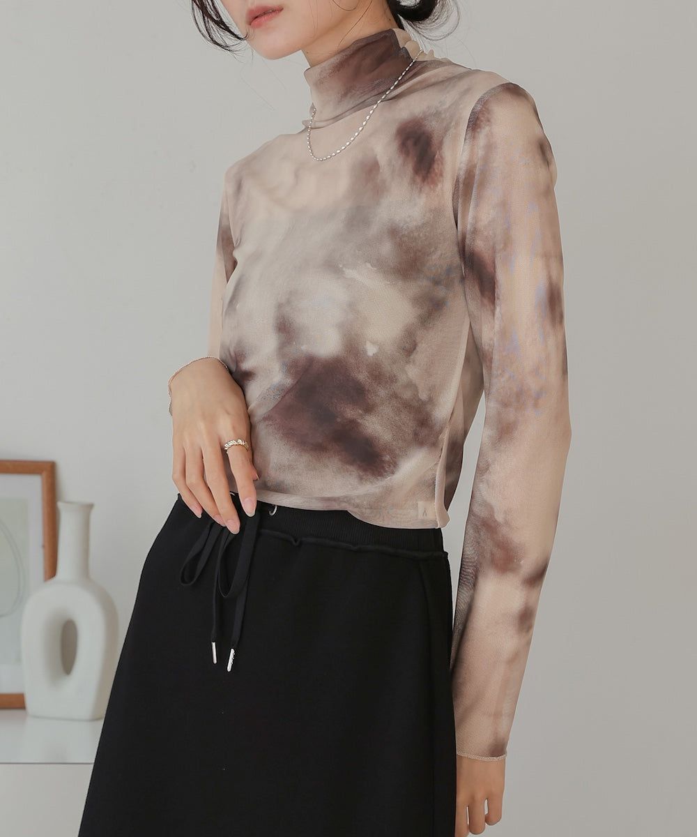 水墨暈染透膚高領薄長袖上衣