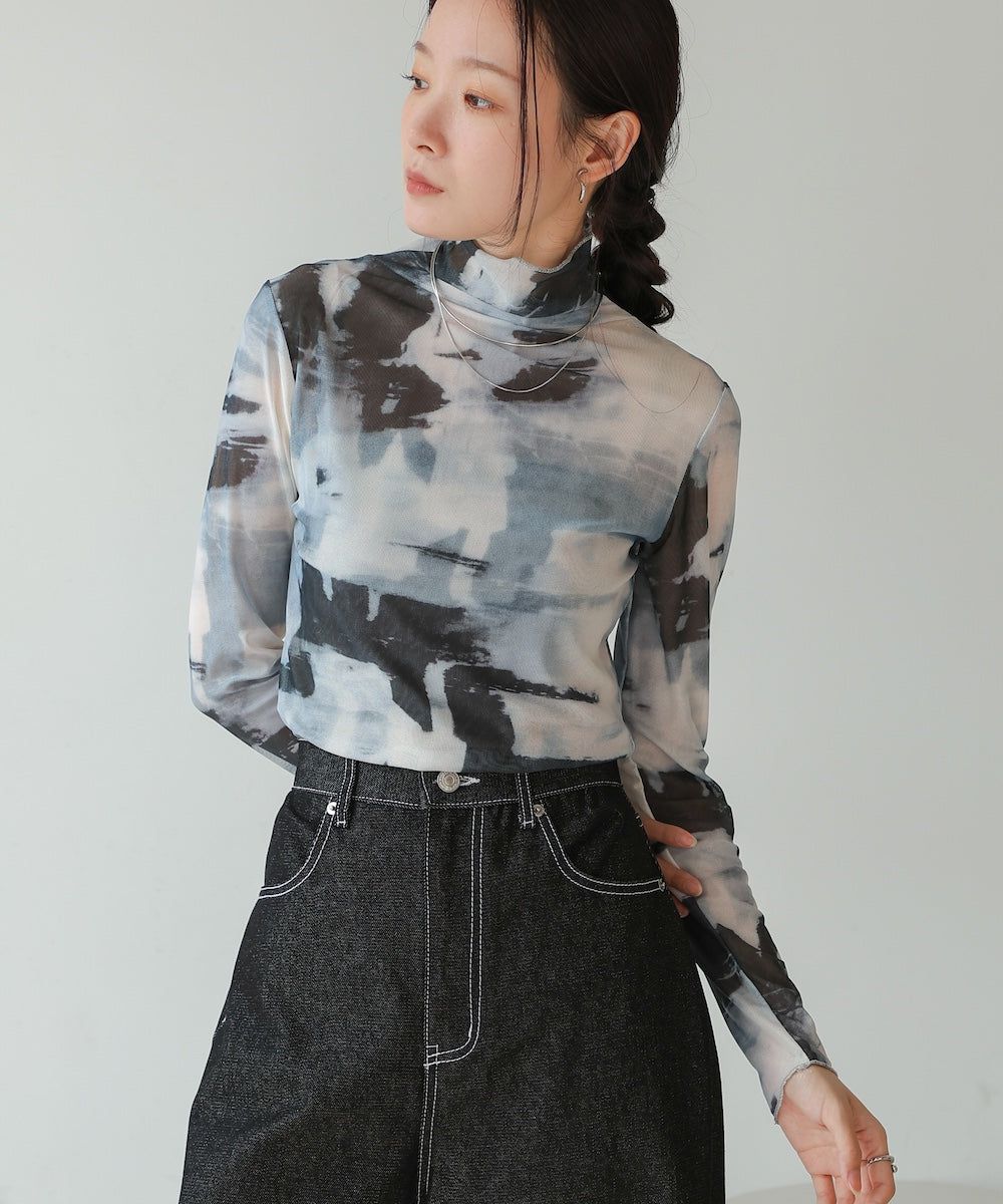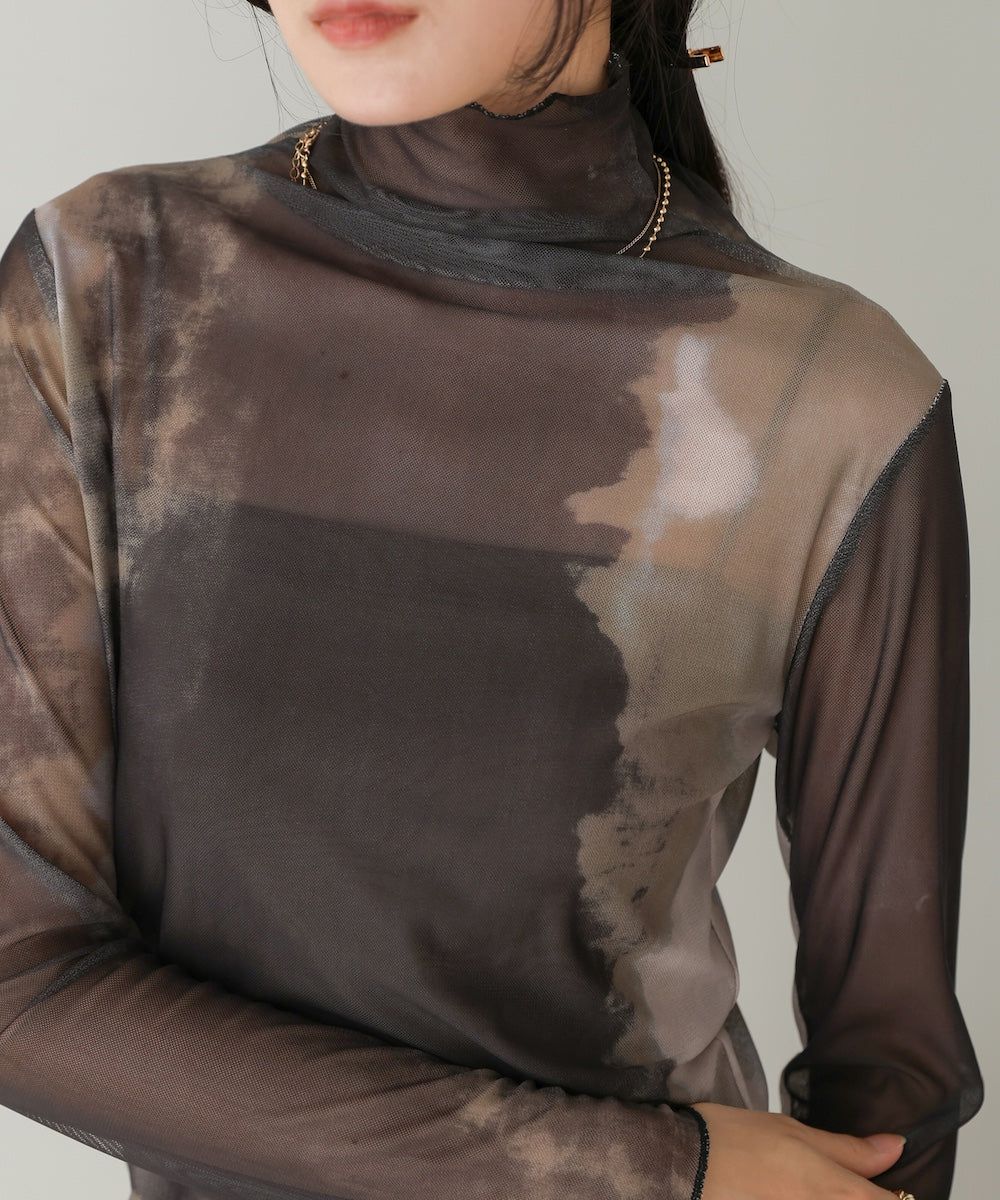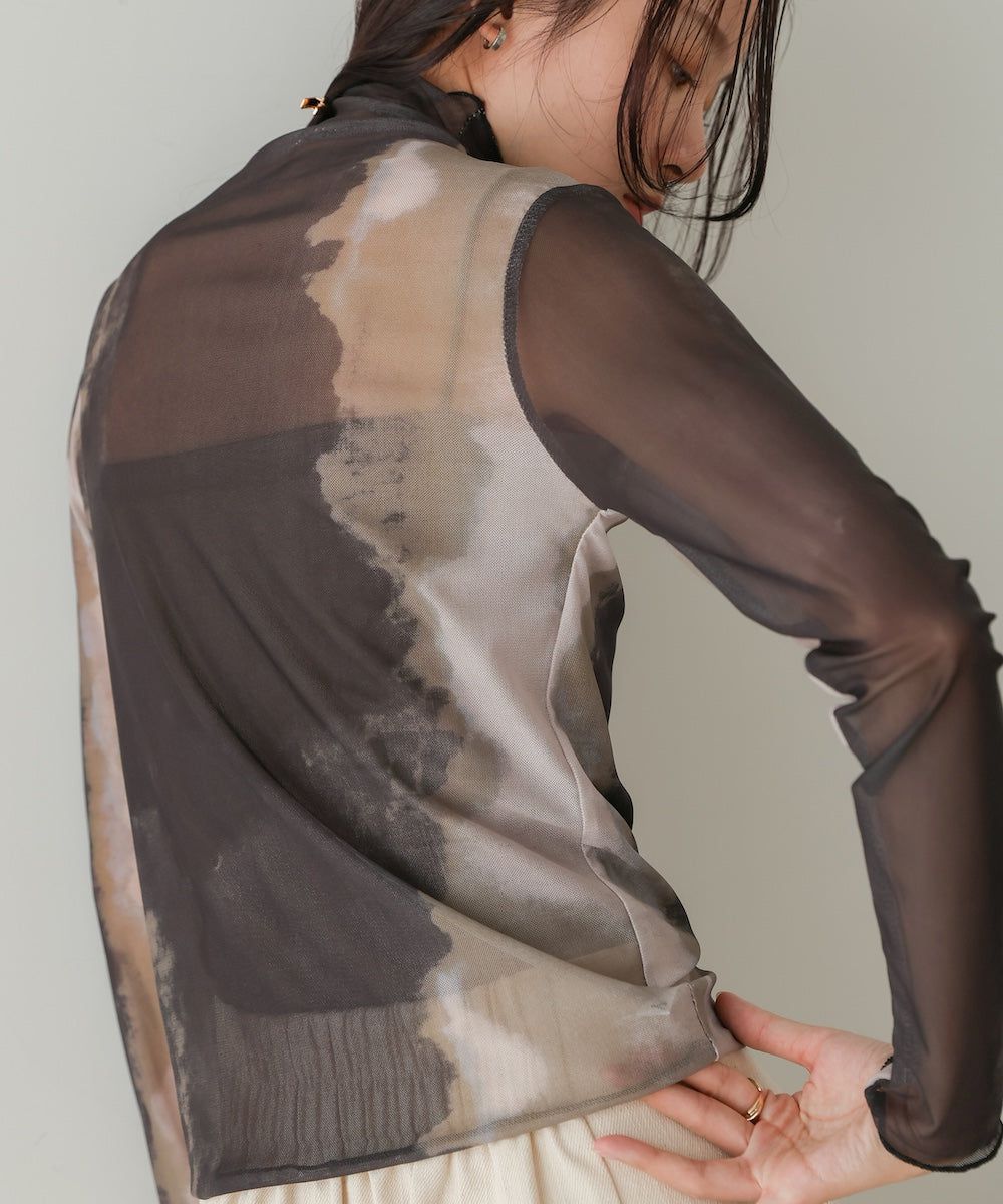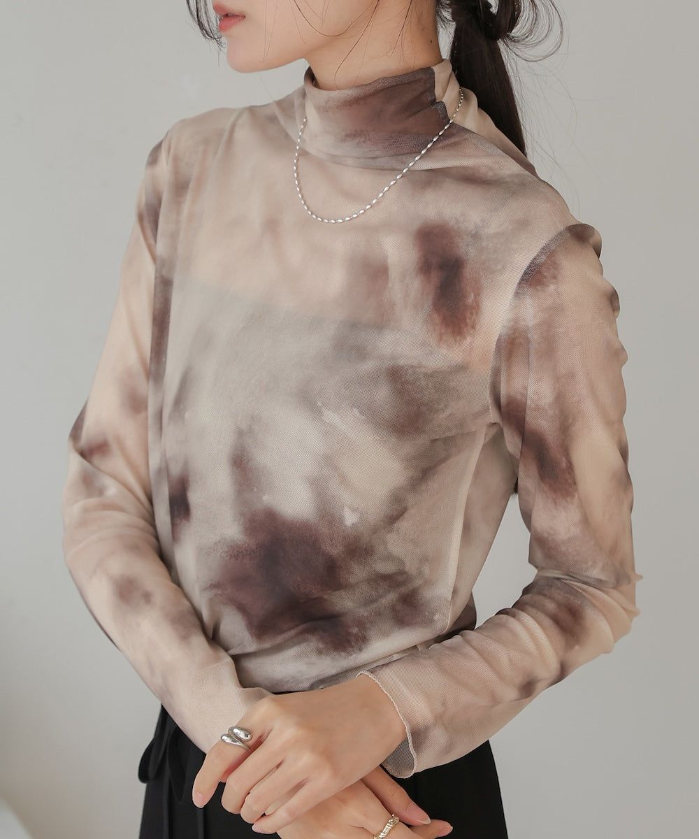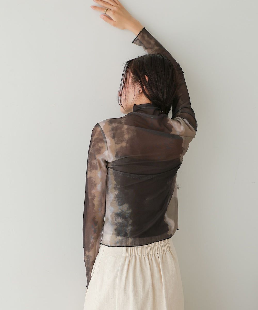 水墨暈染透膚高領薄長袖上衣