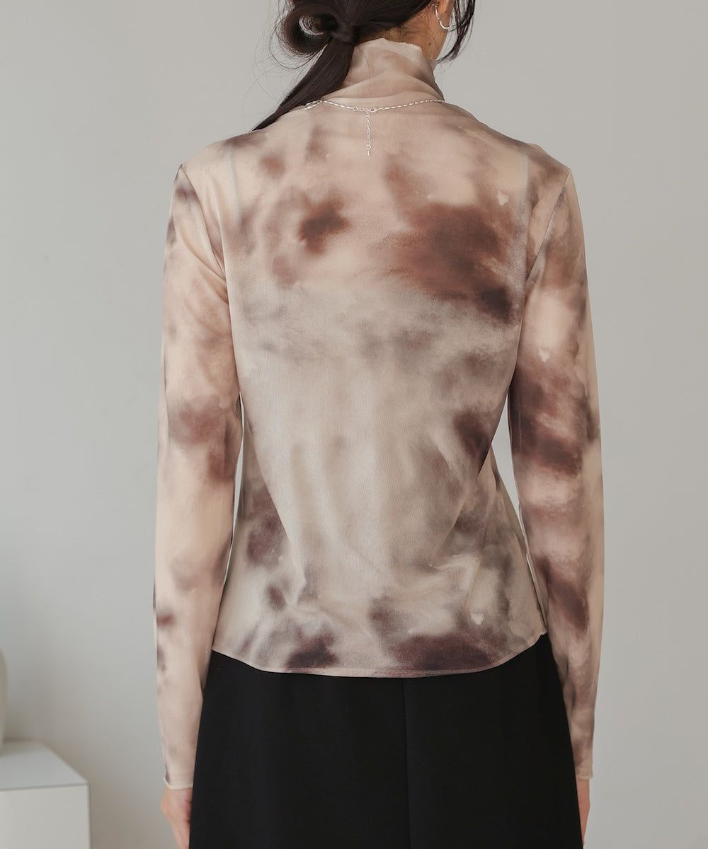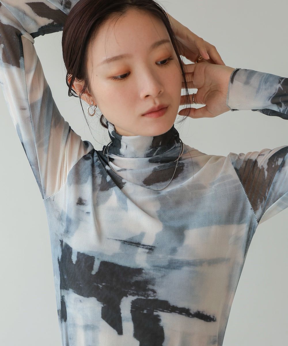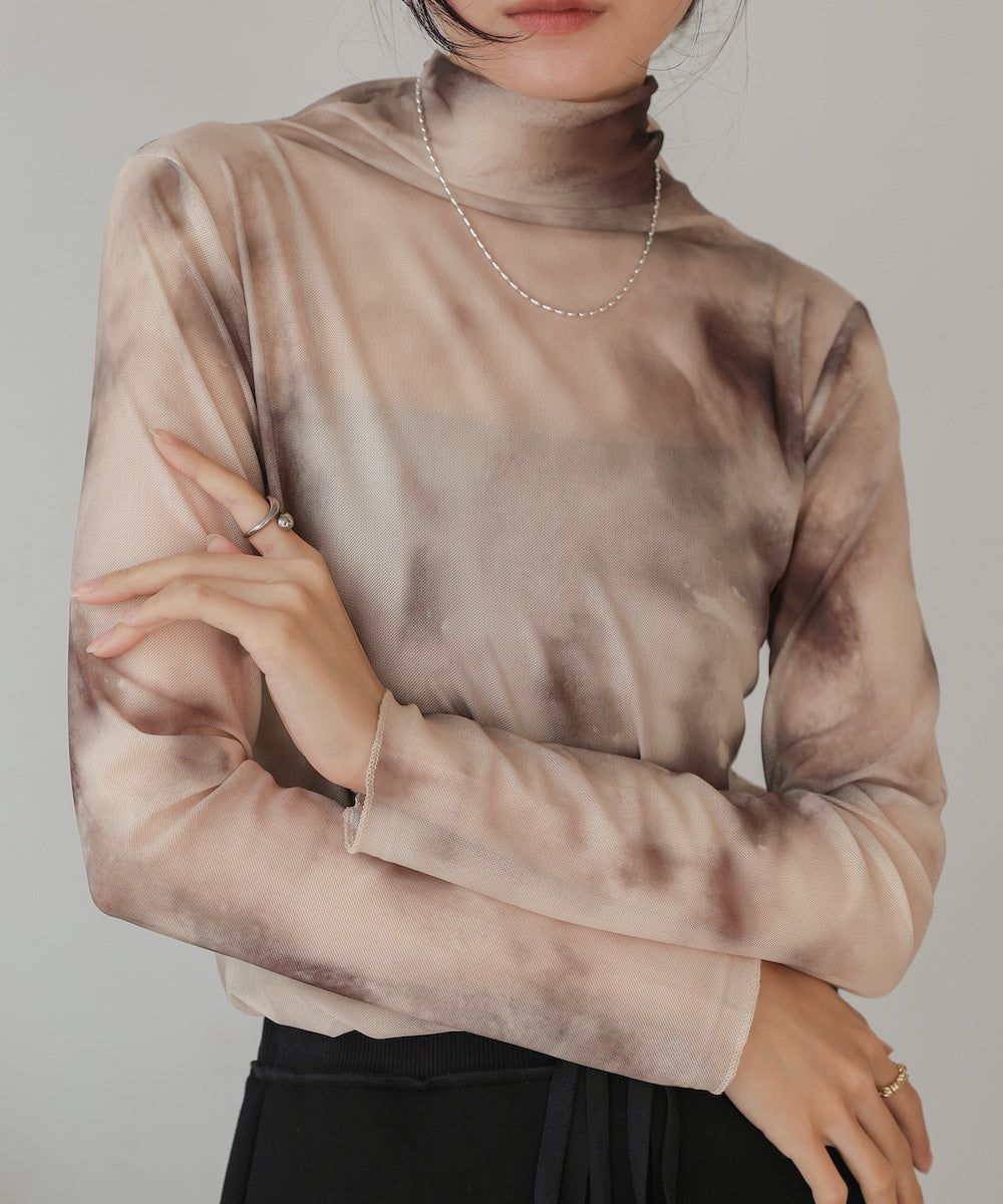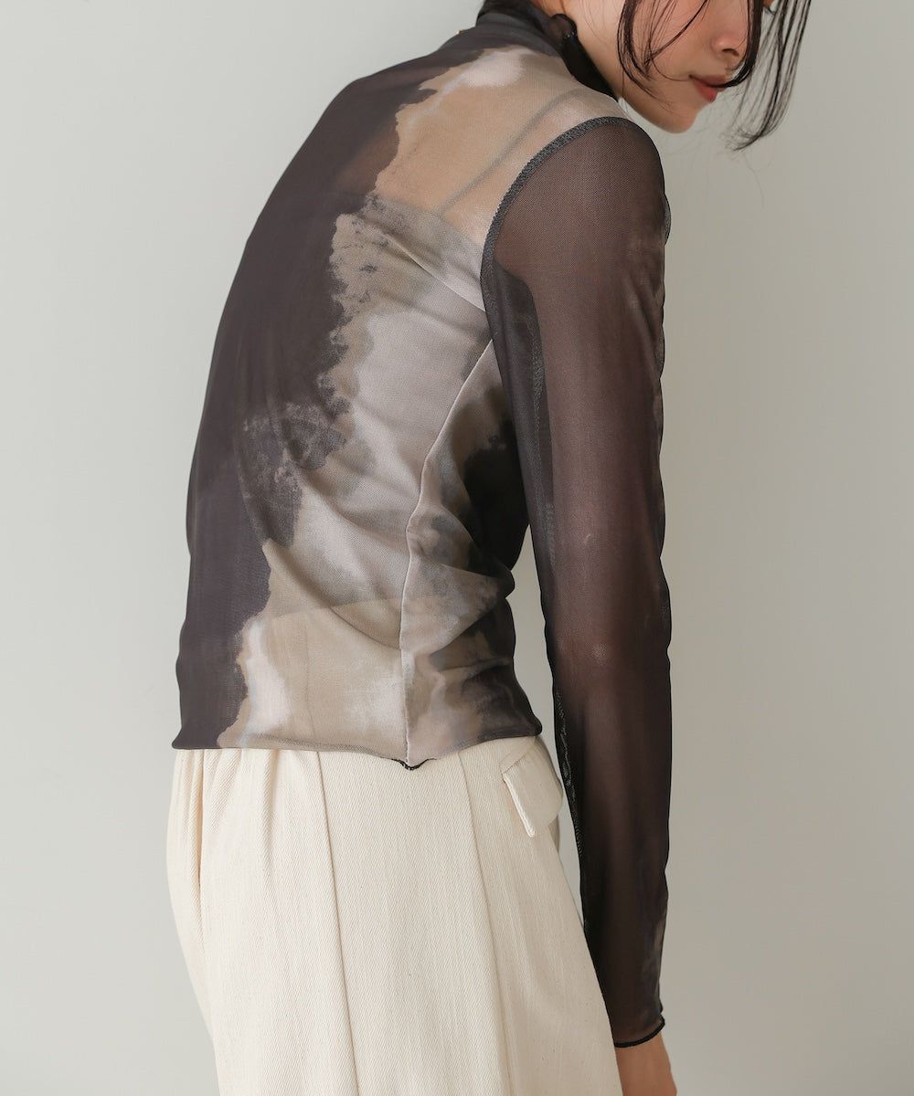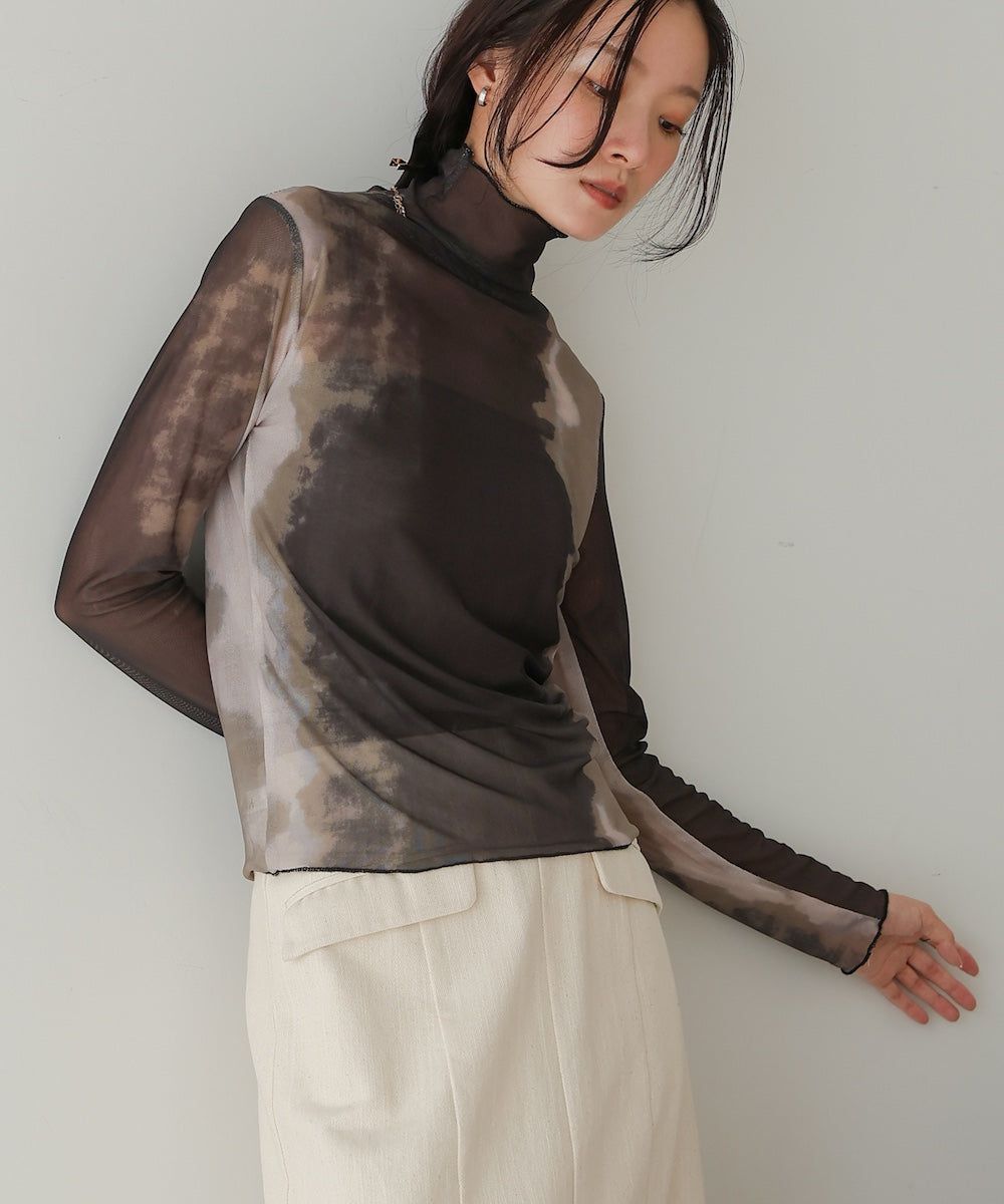 水墨暈染透膚高領薄長袖上衣