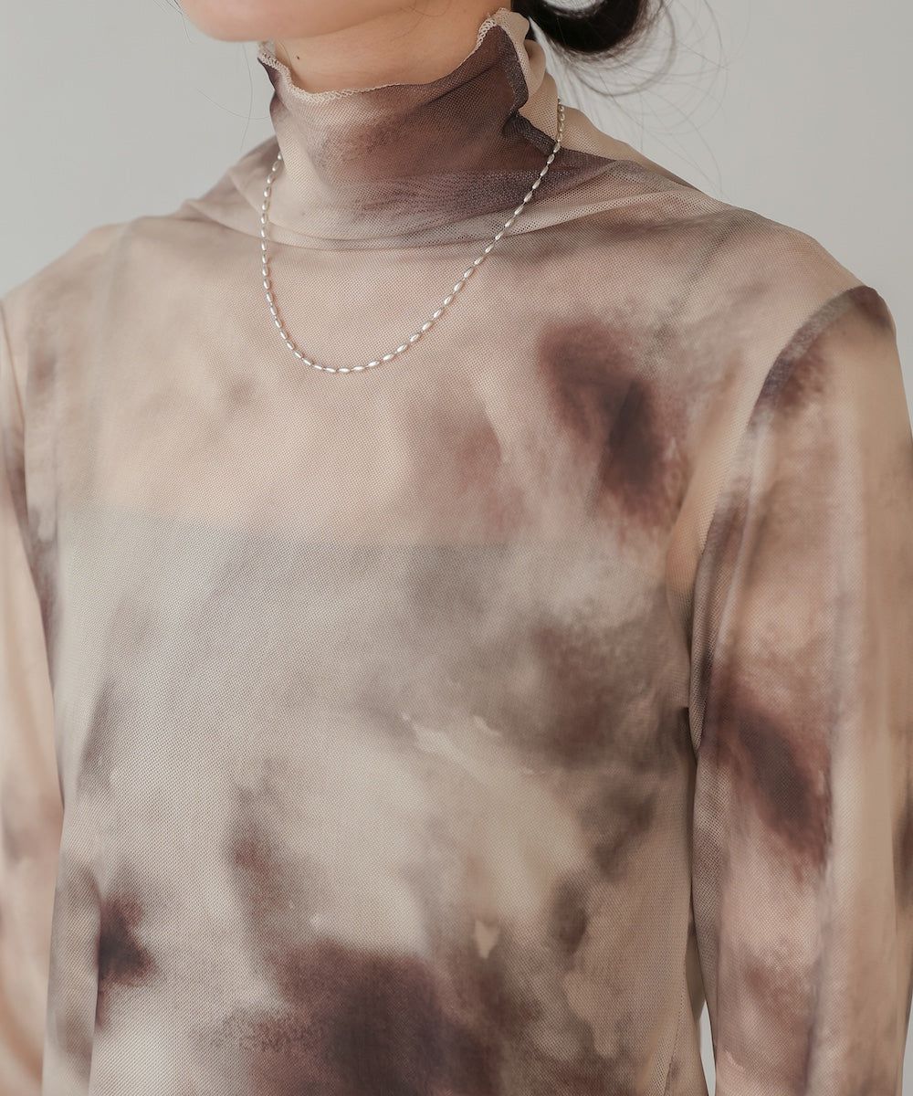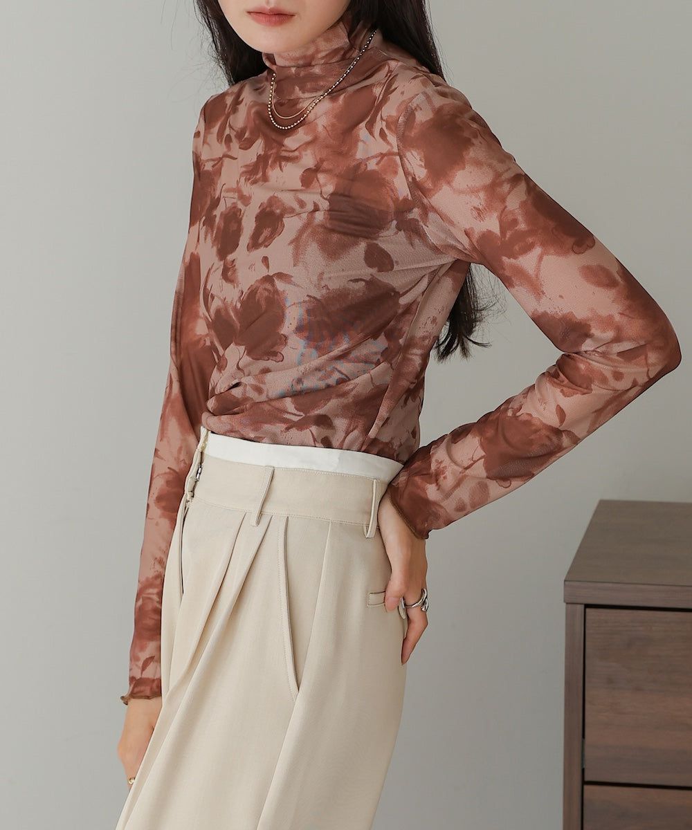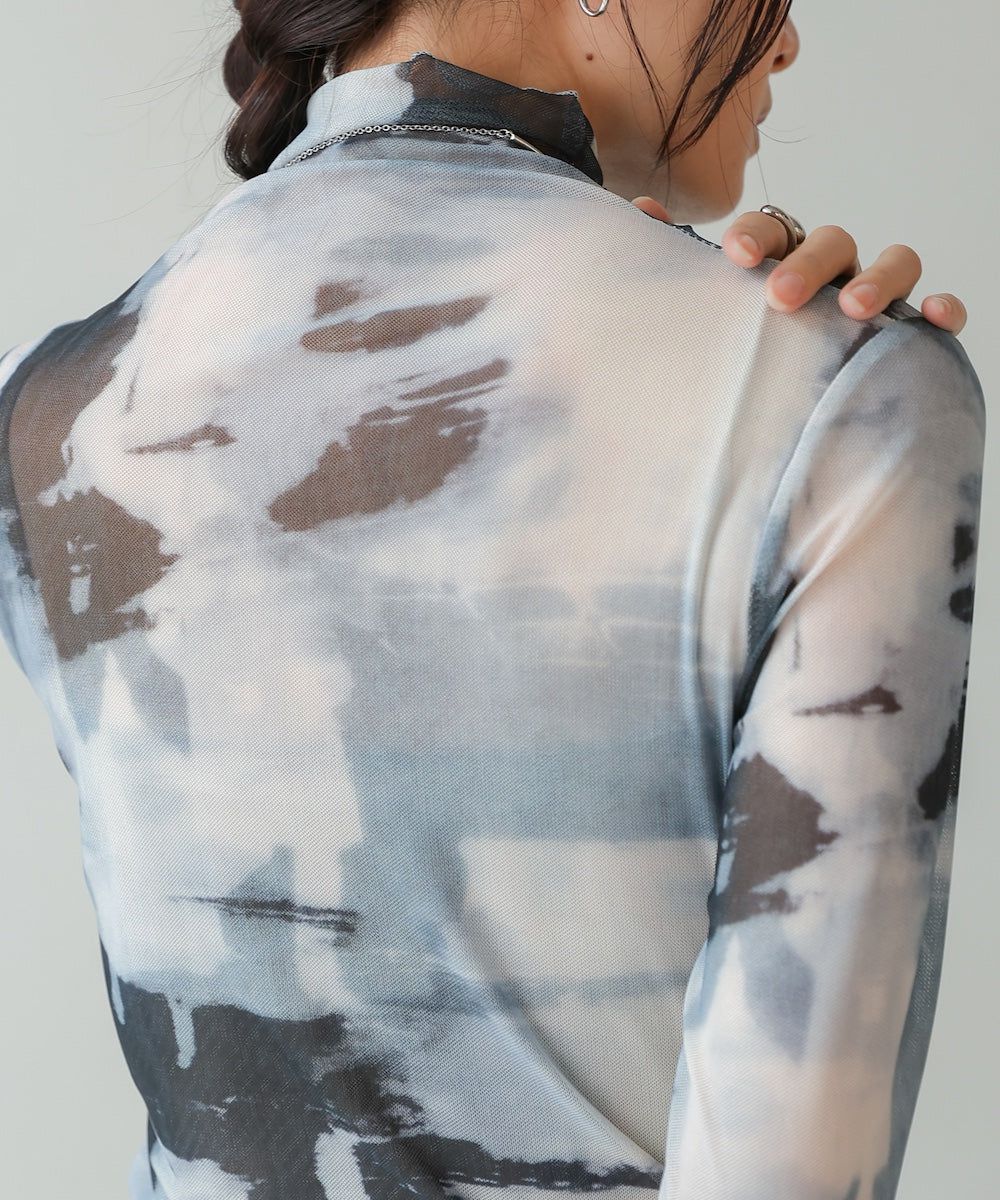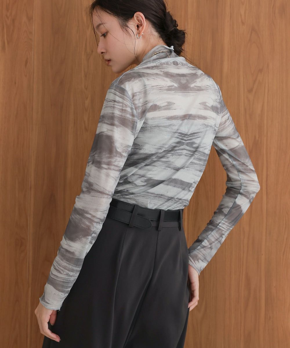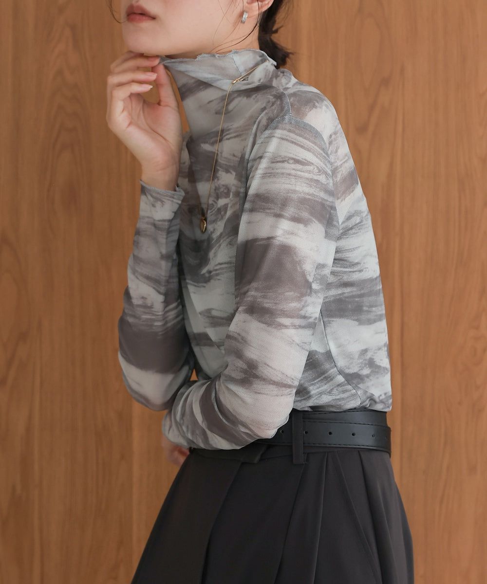 水墨暈染透膚高領薄長袖上衣