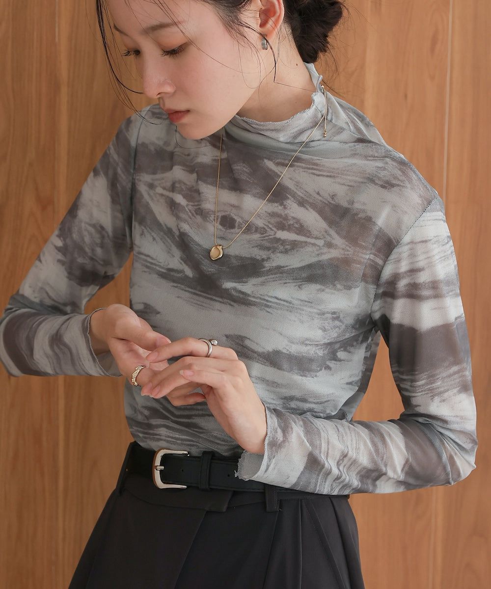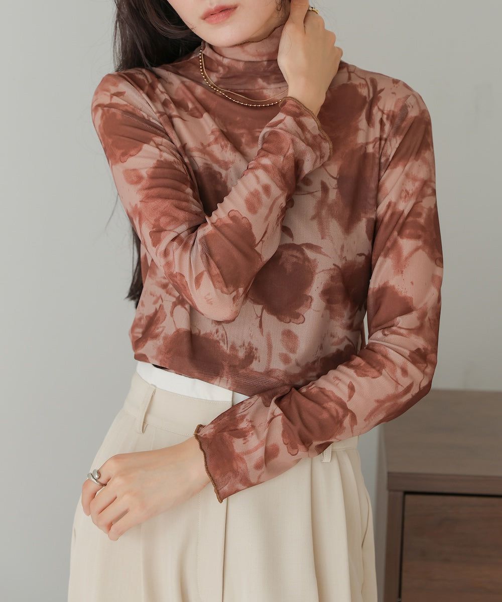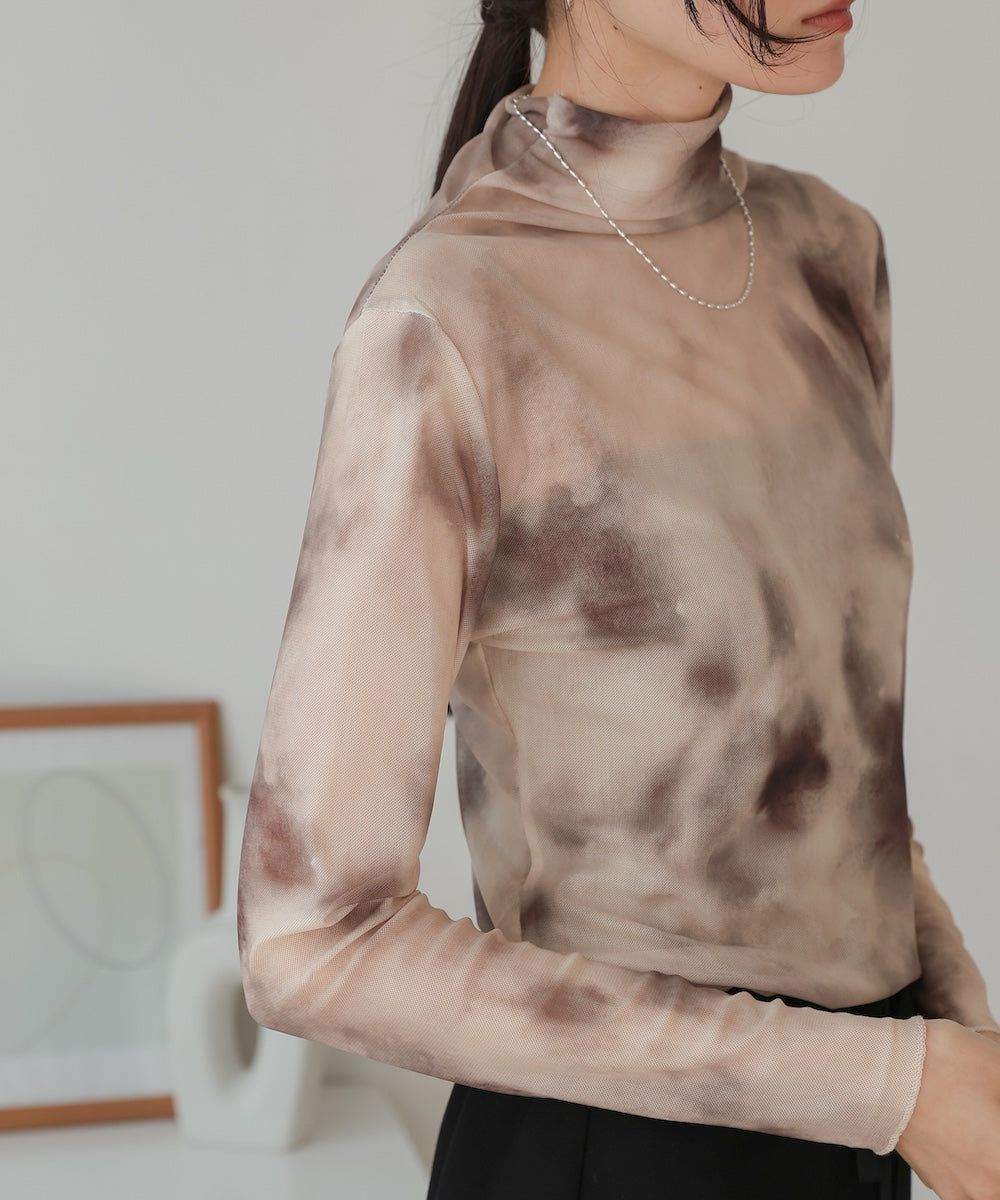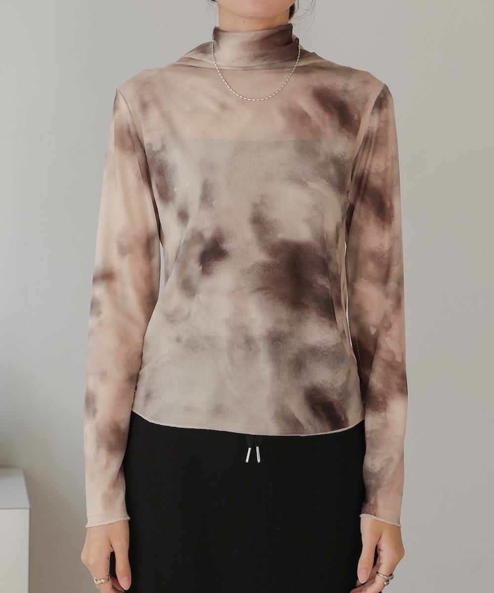 水墨暈染透膚高領薄長袖上衣