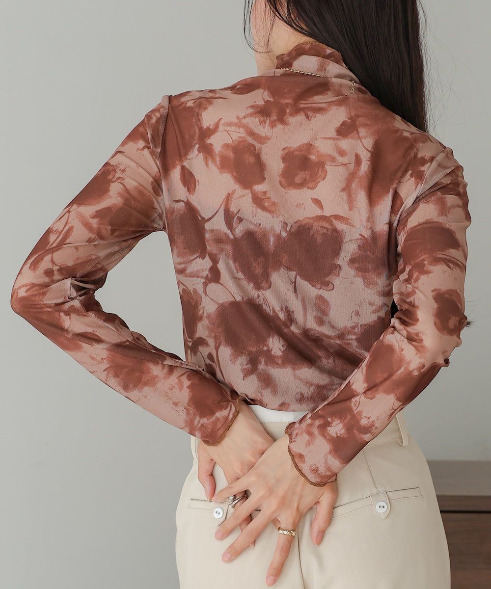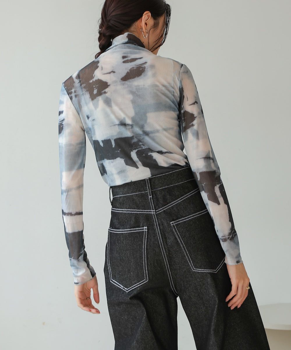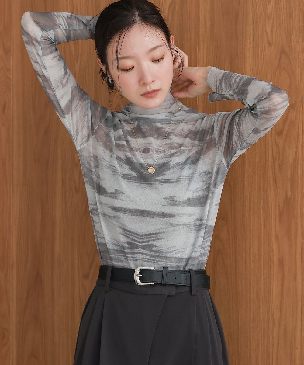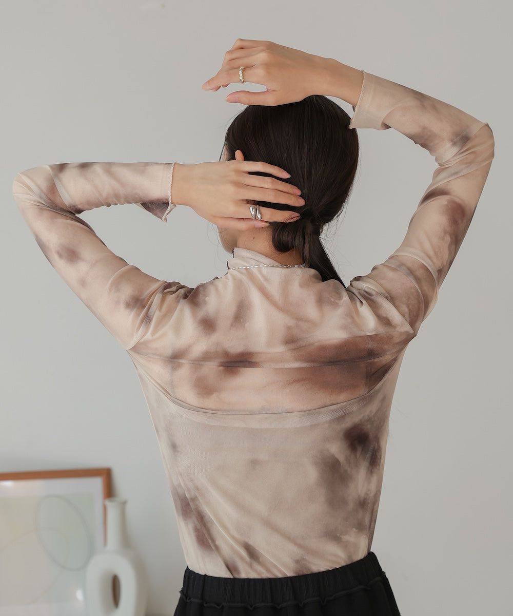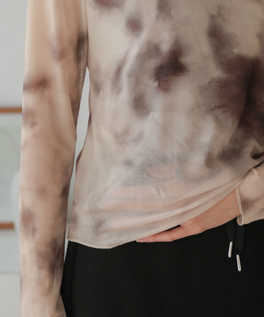 水墨暈染透膚高領薄長袖上衣