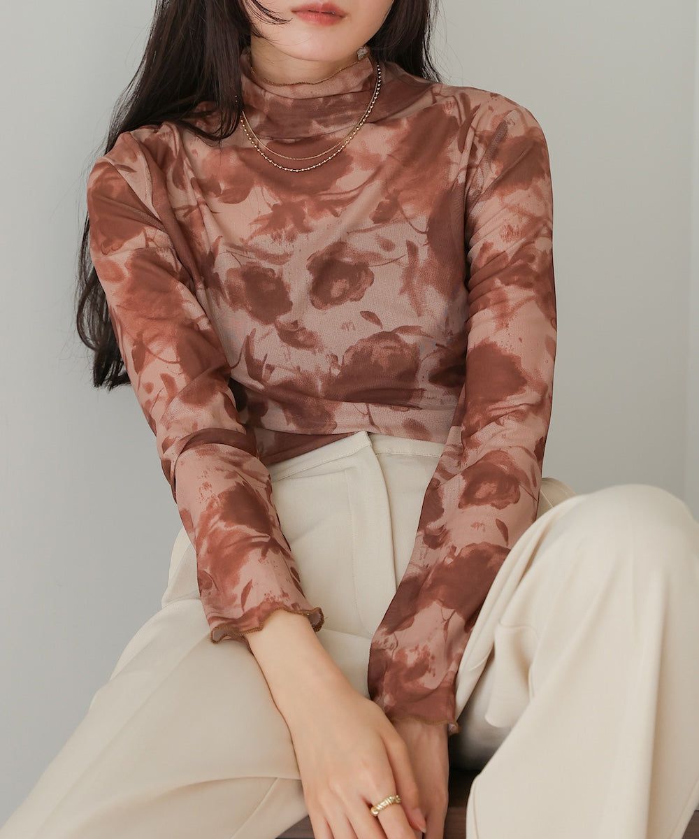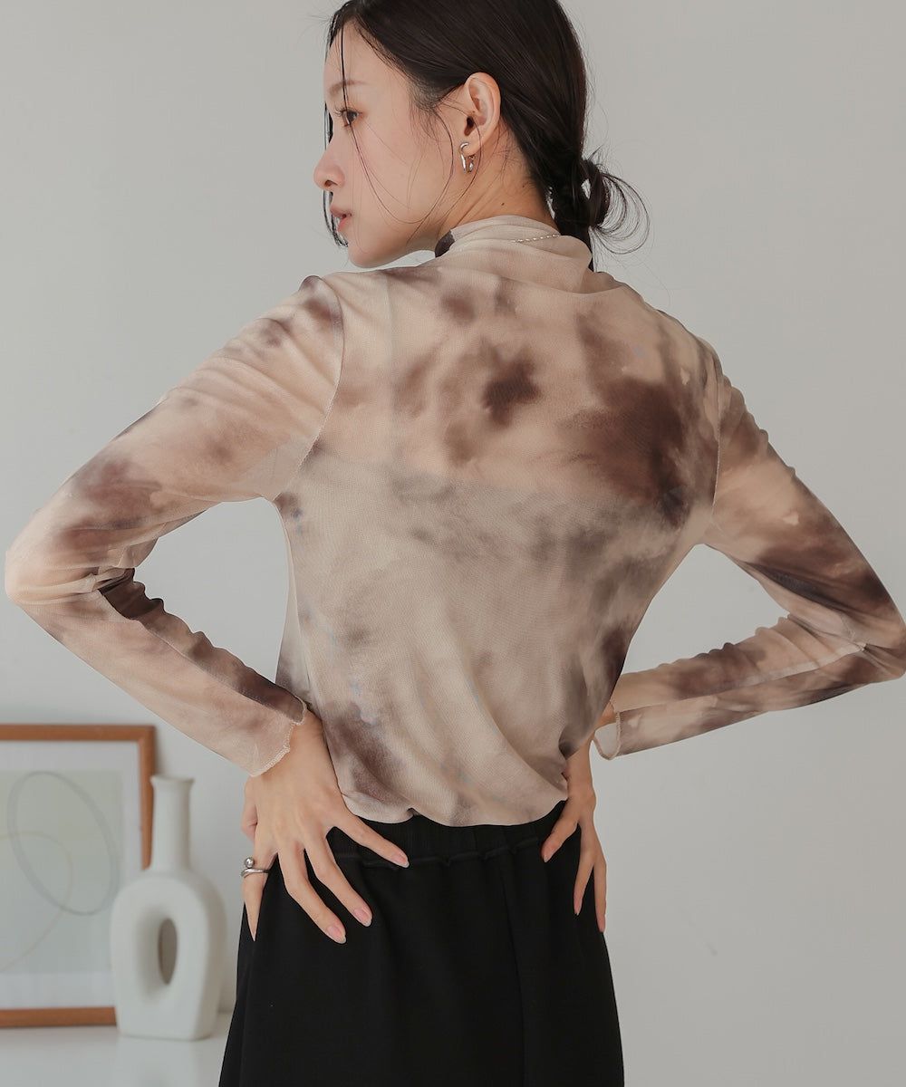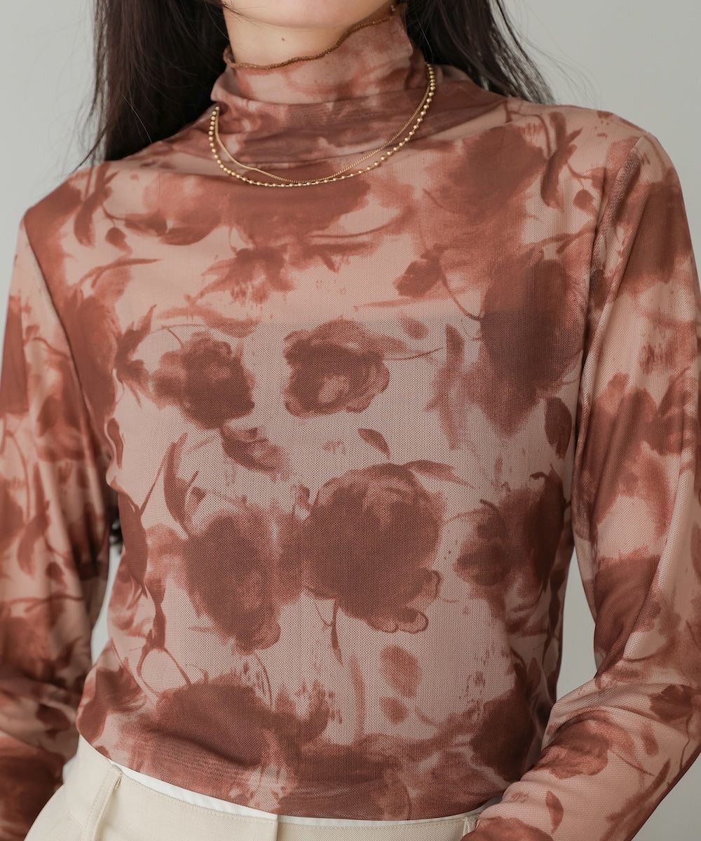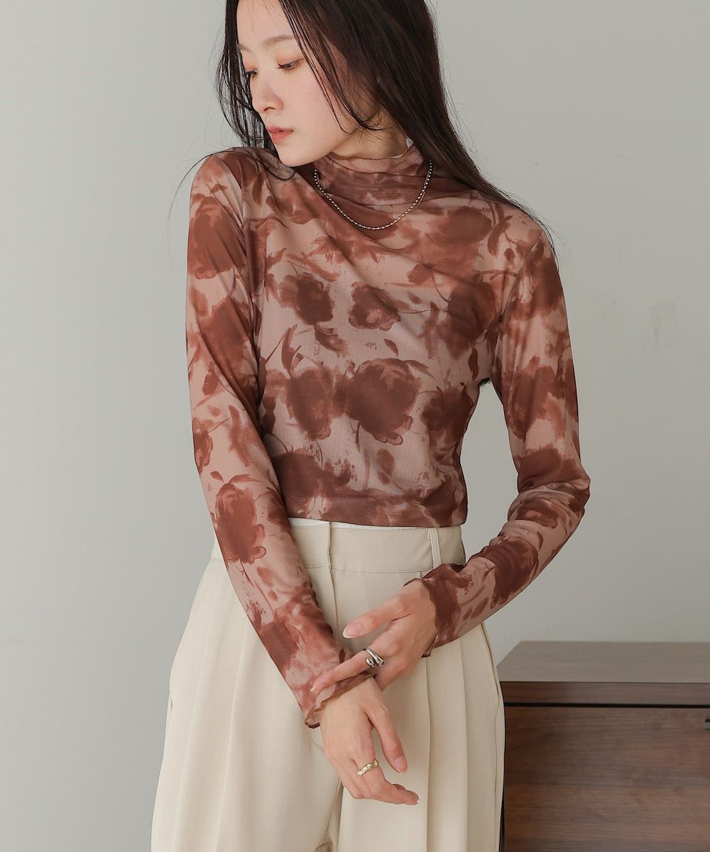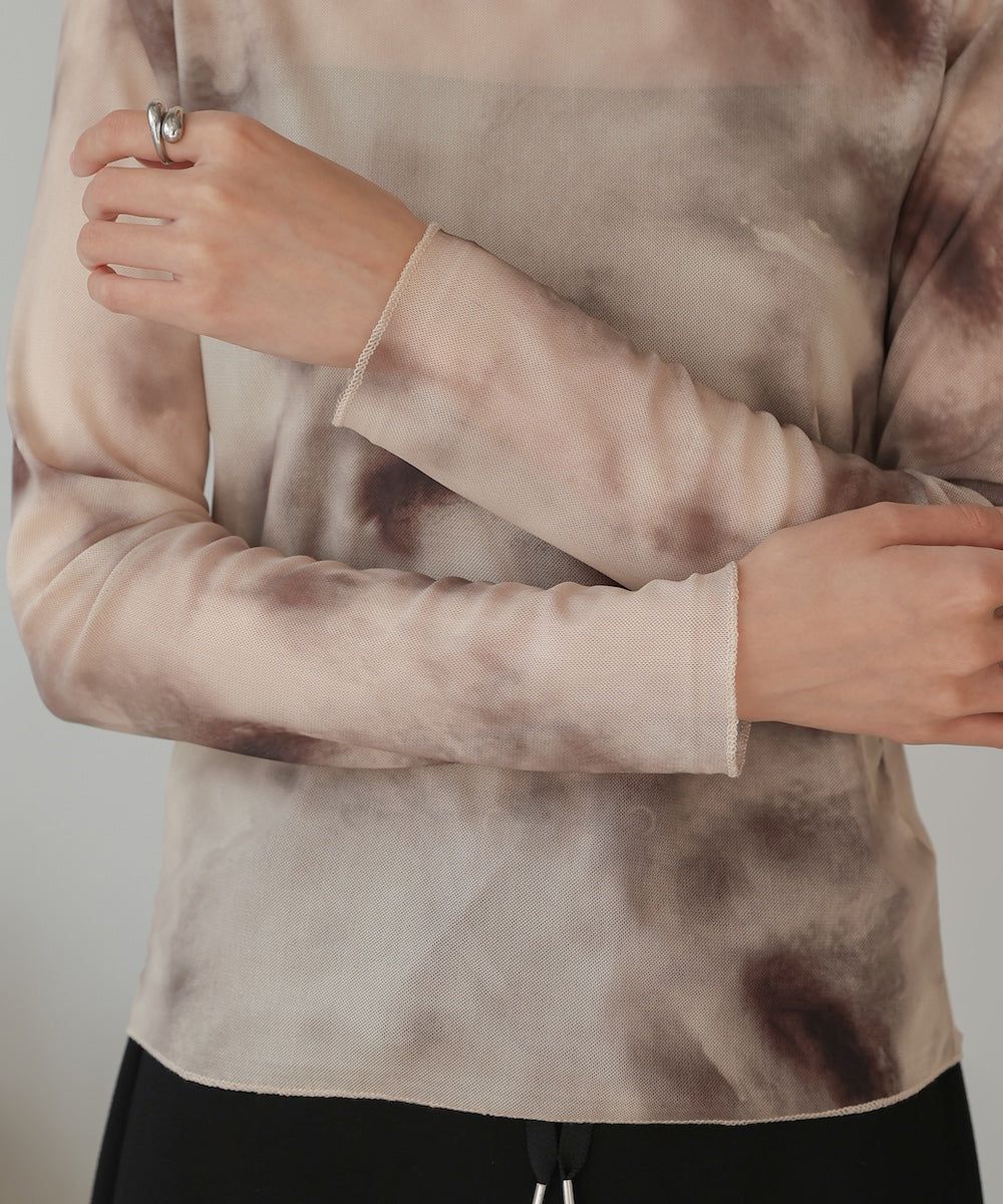 水墨暈染透膚高領薄長袖上衣