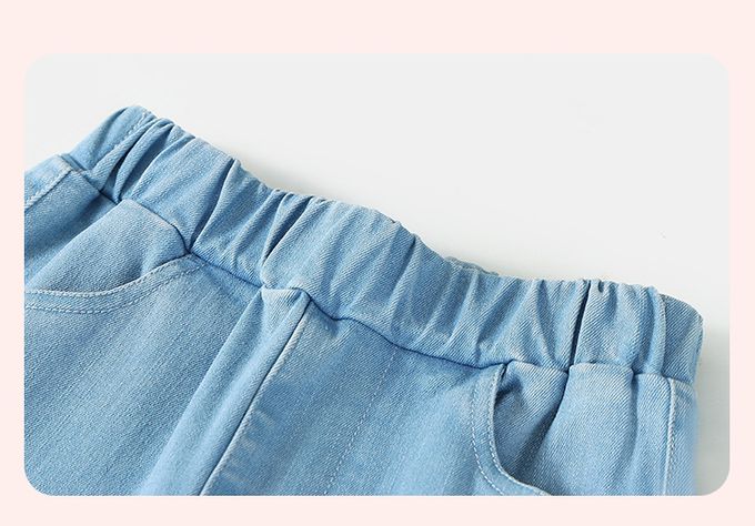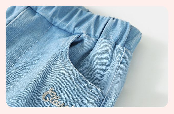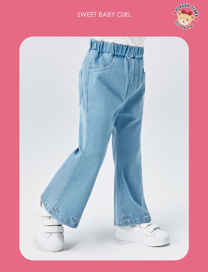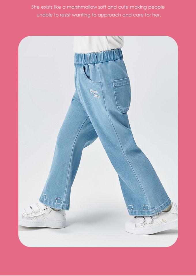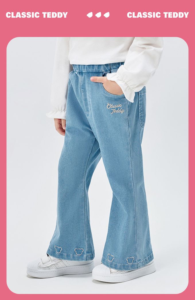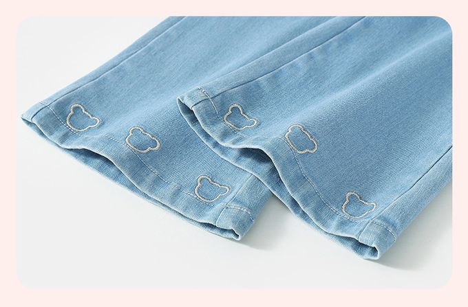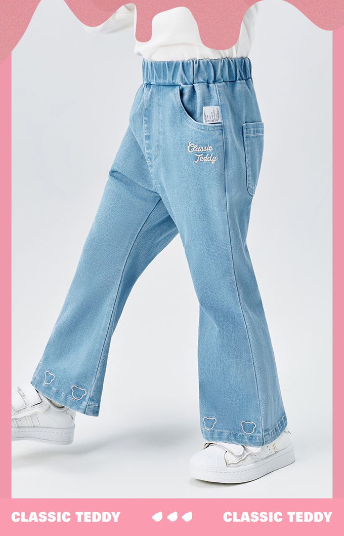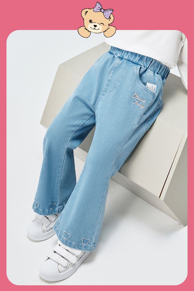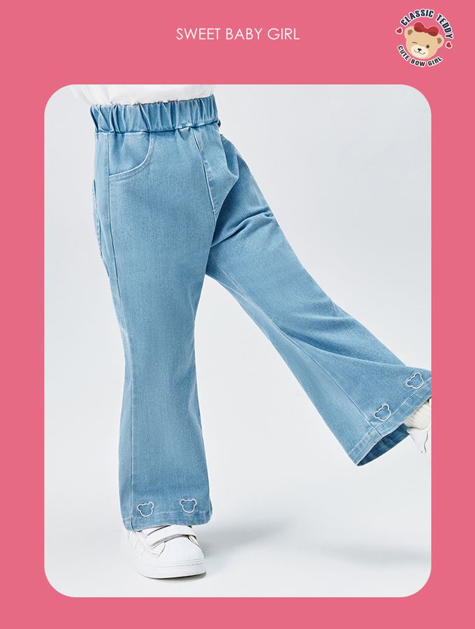 腰鬆緊下擺刺繡牛仔喇叭長褲-泰迪熊-淺藍