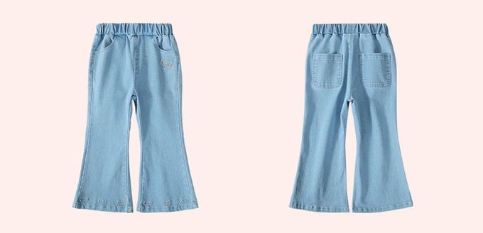 品名:腰鬆緊下擺刺繡牛仔喇叭長褲