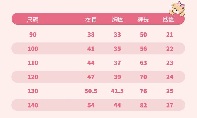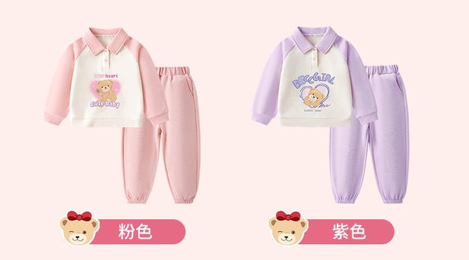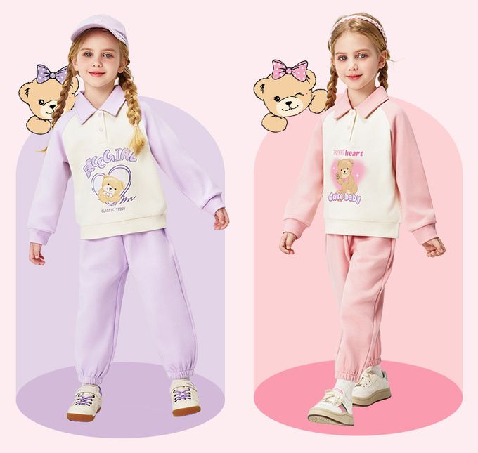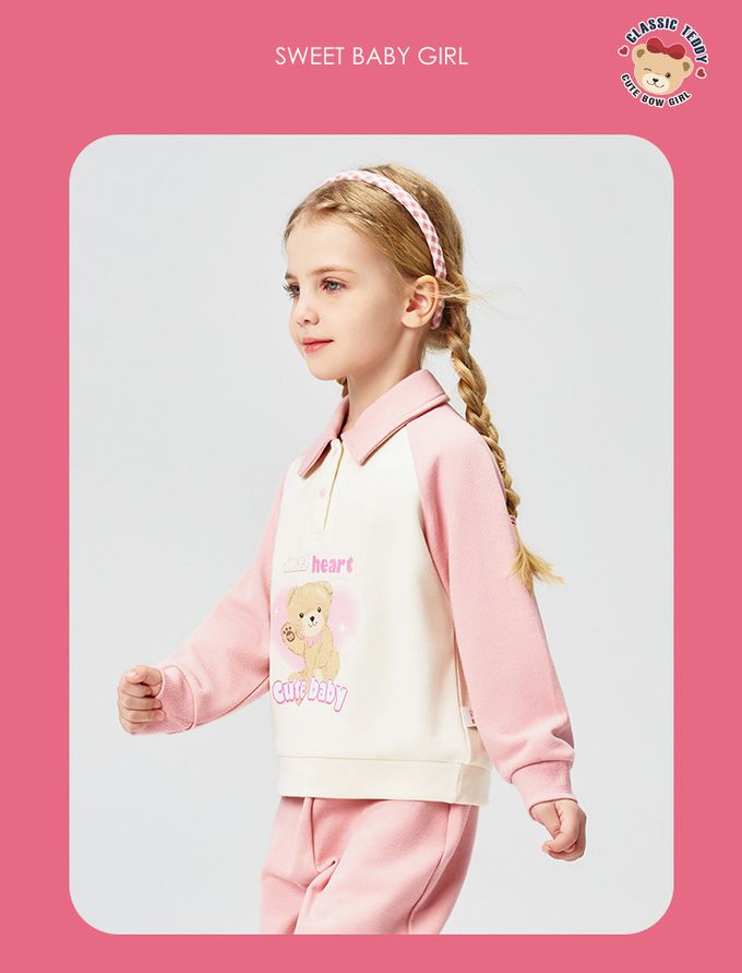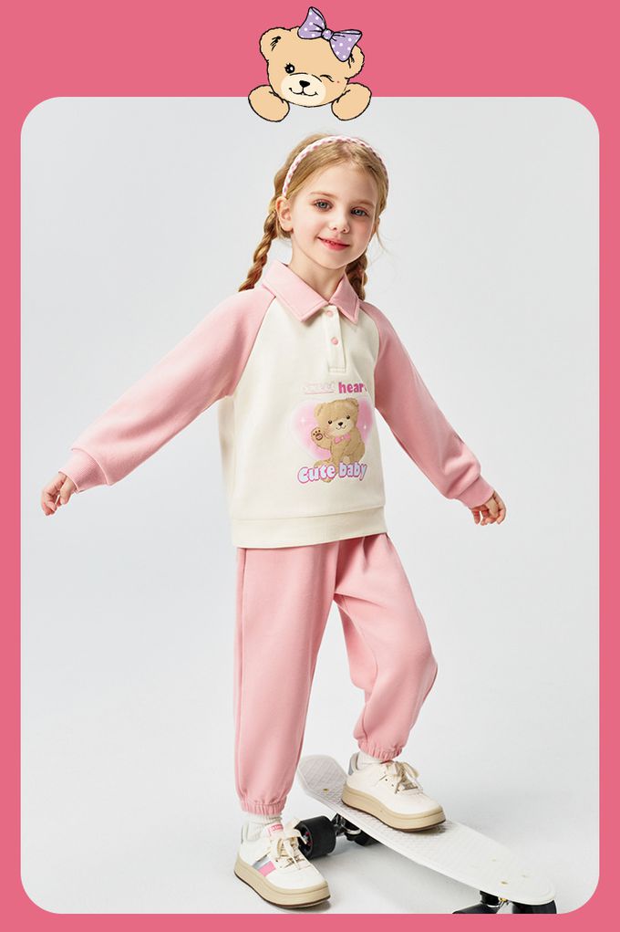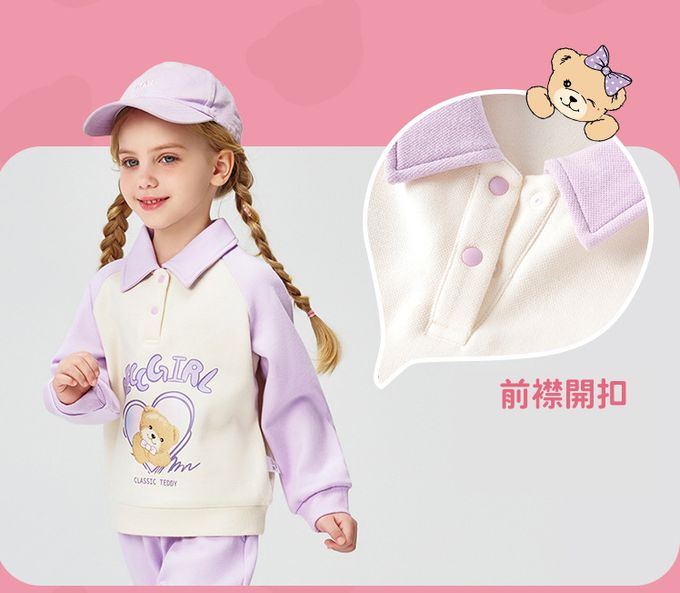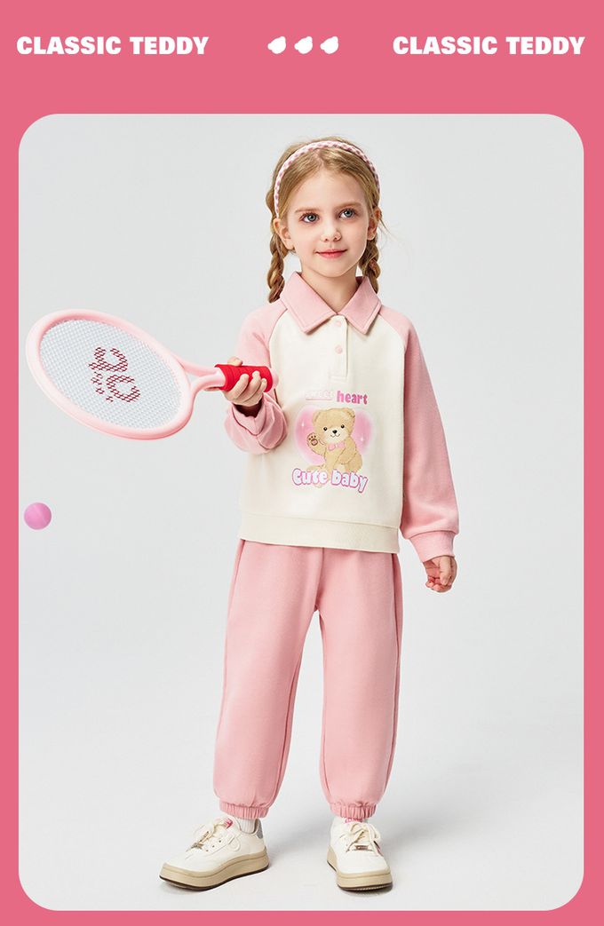 翻領長袖上衣+腰鬆緊休閒長褲兩件式套裝-泰迪熊-粉色