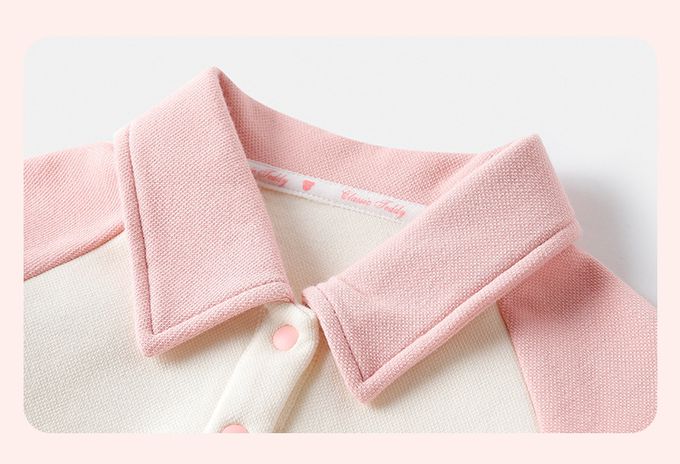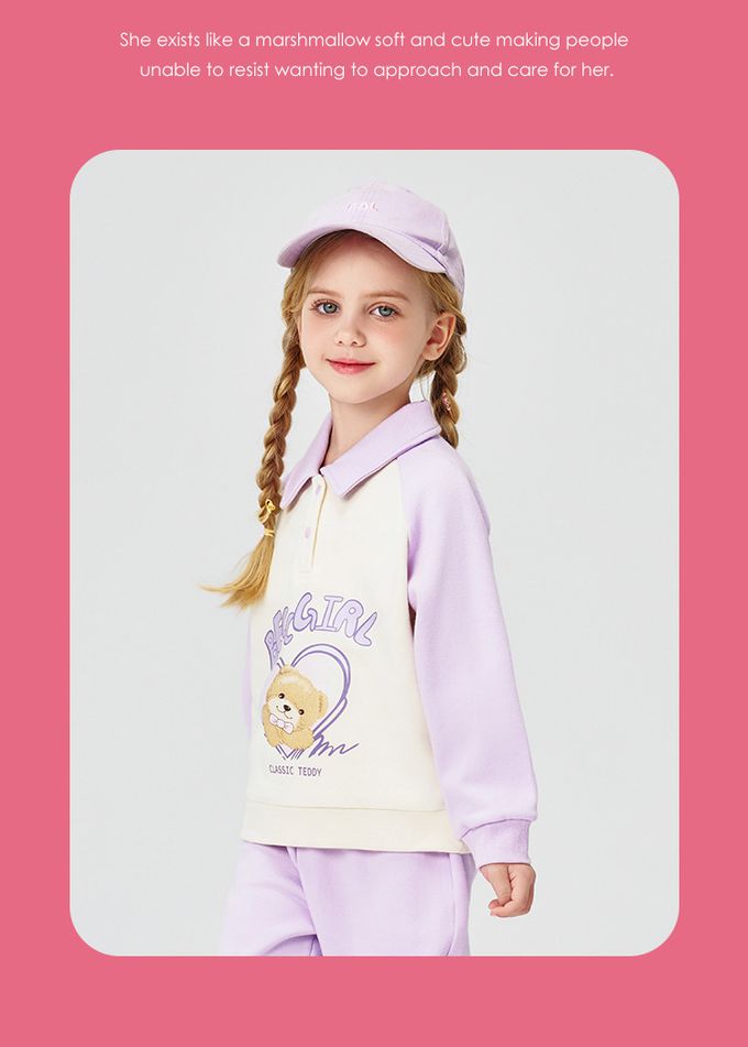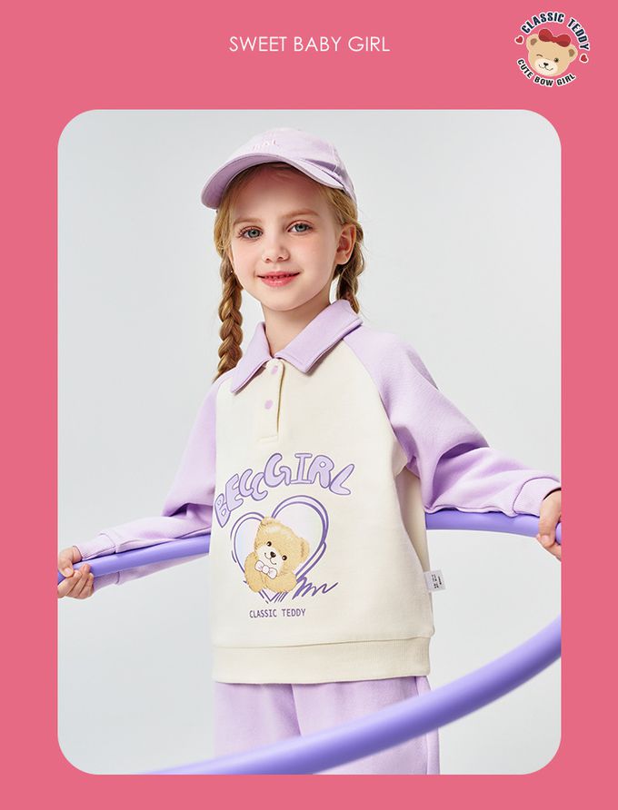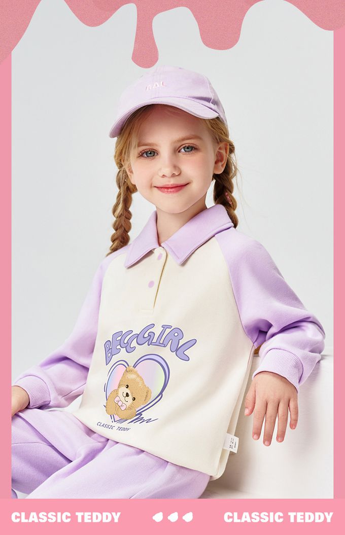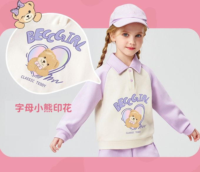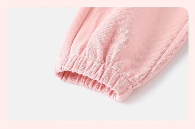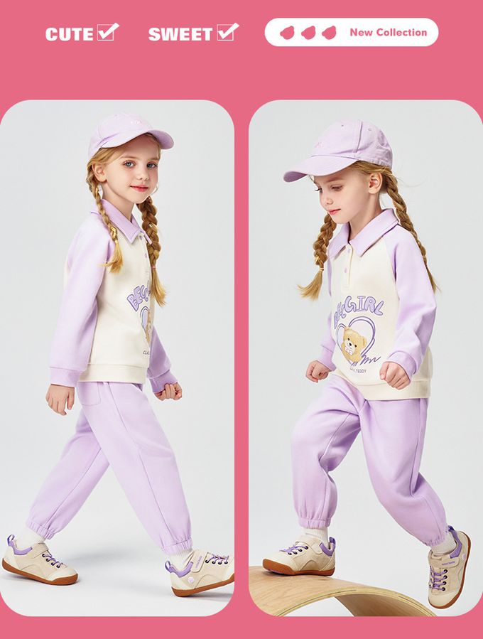 翻領長袖上衣+腰鬆緊休閒長褲兩件式套裝-泰迪熊-粉色