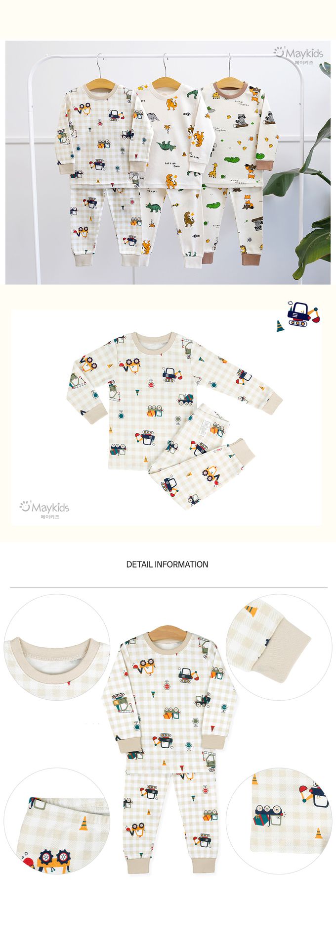 韓國 Maykids - 無螢光30支棉長袖家居服-挖土車車-米膚