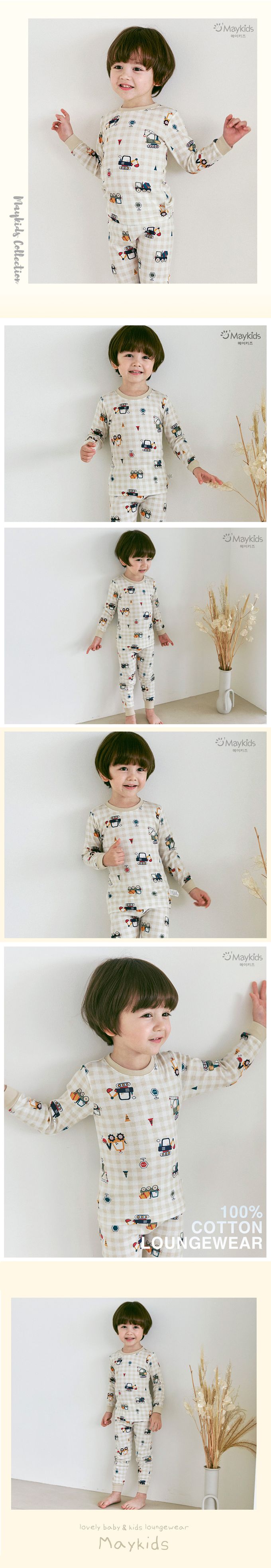 韓國 Maykids - 無螢光30支棉長袖家居服-格紋工程車-米杏