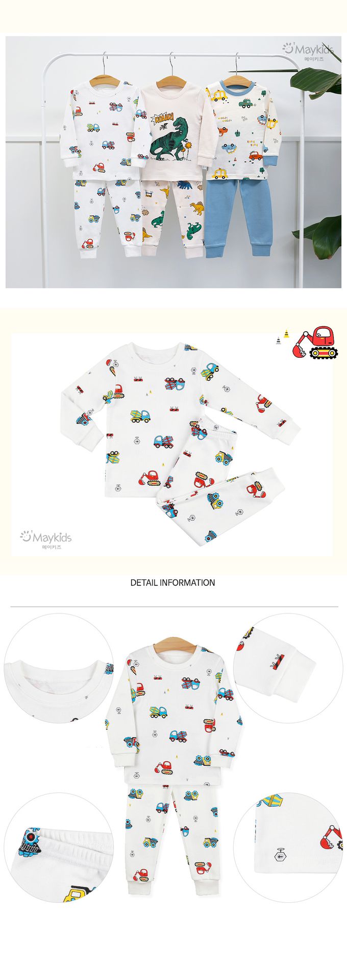 韓國 Maykids - 無螢光20支棉長袖家居服-工地車車-白