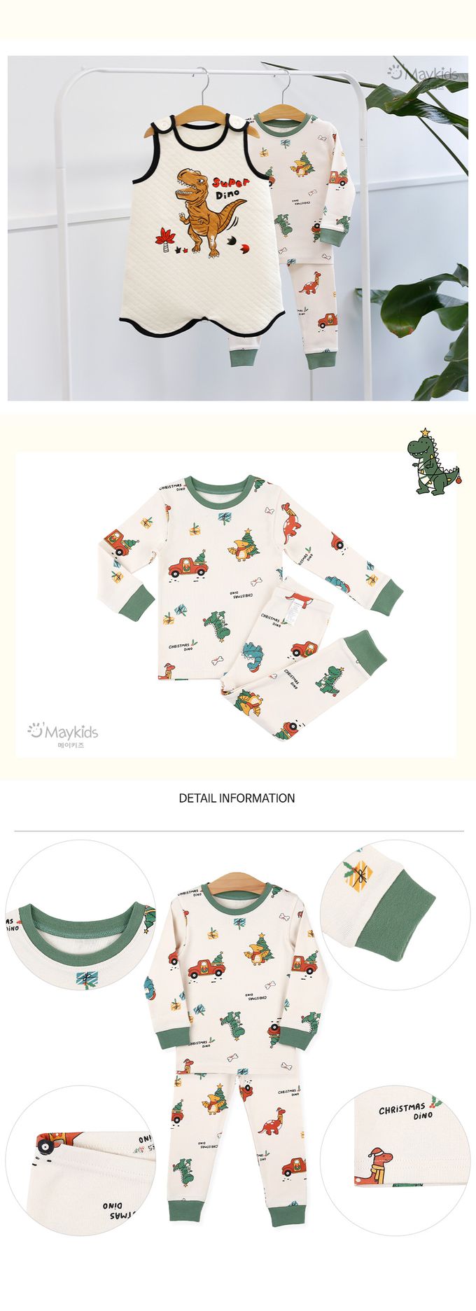 韓國 Maykids - 無螢光20支棉長袖家居服-恐龍聖誕節-米膚
