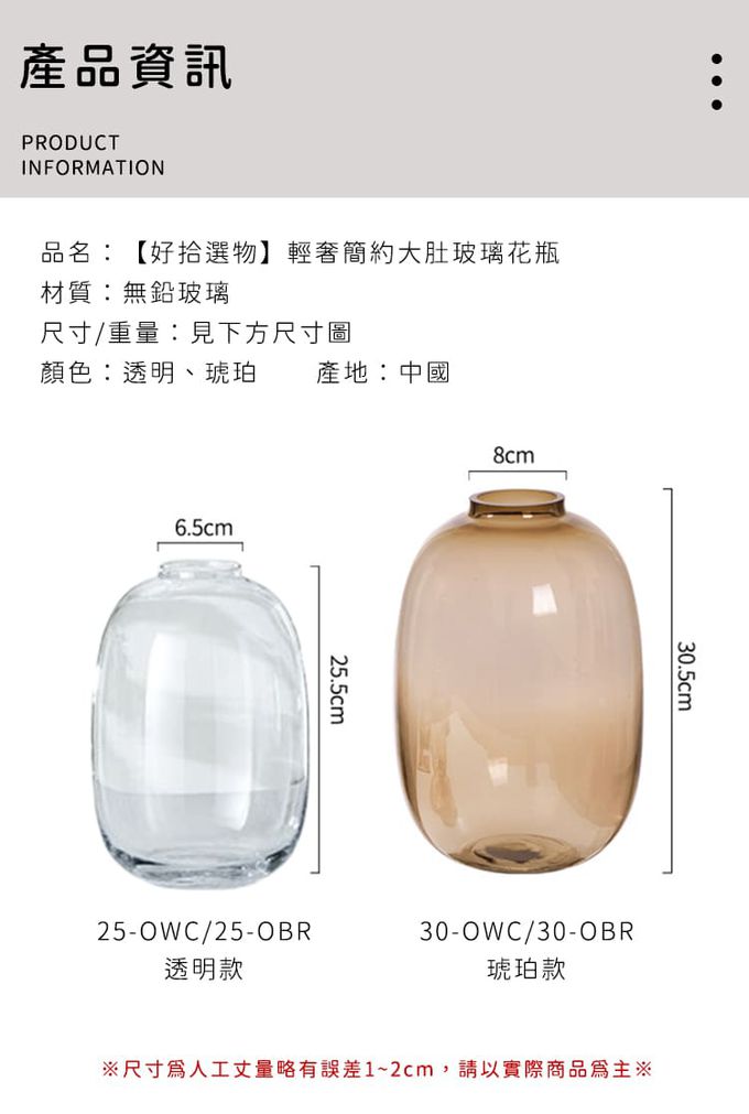 注意事項:*玻璃製品在製作過程因冷熱收縮會有微小氣泡、紋路、些微刮痕,表面不平整紋路、小點(手摸得出來)、水波紋,小凹痕,瓶身也會有接痕(每支都有)等以上情況都是正常的,不影響商品正常使用並不是瑕疵品喔! 1.商品到貨享鑑賞期之權益,鑑賞期並非試用期,辦理退貨商品必須是全新狀態且紙箱及商品配件包裝須完整。商品一經使用或組裝後,恕無法辦理退換貨。 2.網頁商品會因面板螢幕解析度不同,造成圖片顏色呈現略有不同,請以實品顏色為準。 3.商品為人工丈量略有1~3公分內誤差,請以實品為主。 4.商品收到時若有破損或裂痕,請勿使用,並請在24小時內向購買平台反映商品狀況。 5.商品圖為情境示意圖,本商品內容不包含擺飾物品。 6.請避免放置於兒童可拿取之處。 7.請勿掉落、及大力碰撞,避免發生破損問題。 8.請勿使用硬毛刷,鋼絲球等洗刷。