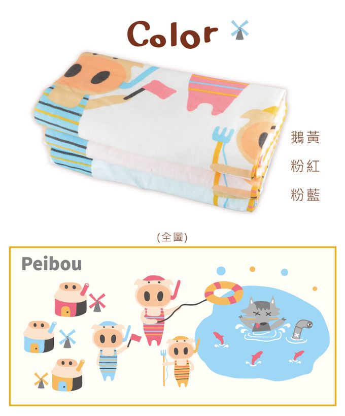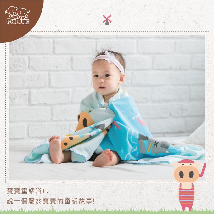 貝柔 Peilou - 童話抗菌紗布浴巾-三隻小豬-粉藍 (70x140cm)-限時特惠贈童巾*1-顏色隨機